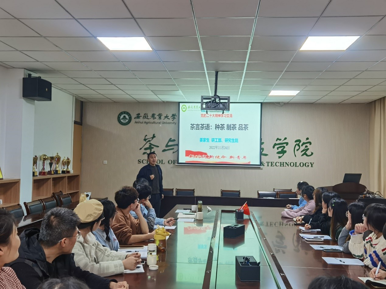 姜家生结合学校学院专业特色,为大家作《茶言茶语:种茶 制茶 品茶》党的二十大精神学习交流报告。报告从种茶、制茶、品茶、悟茶四个部分,引导学生干部要养成良好品质、提升能力素质、时常反躬自省、注重总结提升,有“想为”之境界、“敢为”之担当、“勤为”之作风、“善为”之能力,做有心、贴心、入心的好干部。作为学院研究生骨干,要全面学习全面把握全面落实党的二十大精神,自觉用习近平新时代中国特色社会主义思想武装头脑,怀抱梦想又脚踏实地,敢想敢为又善作善成,主动践行“大别山道路”精神,立志做有理想、敢担当、能吃苦、肯奋斗的新时代好青年。同时,要将党的二十大精神贯彻到学生工作各方面,充分发挥青年学生骨干政治引领排头兵作用,把青春投入火热实践,让青春绽放绚丽之花!