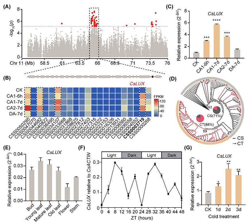 低温胁迫严重影响茶叶的产量与品质。培育优质高抗茶树新品种是我国茶产业发展的迫切需求,而解析茶树抗寒性状的遗传机制则是培育高抗寒茶树新品种的关键。为此,本研究利用全基因组关联分析鉴定得到一个受低温显著诱导的昼夜节律核心基因CsLUX,并通过茶树体内基因沉默和异源过表达拟南芥等实验,证实了CsLUX应答茶树低温胁迫的功能。为进一步解析其调控机制,研究利用转录组分析、酵母单/双杂交、EMSA和双荧光报告系统等实验,发现CsLUX可直接结合CsLOX2和CsJAZ1的启动子并调控其表达水平,进而动态调控茉莉酸合成与信号转导响应茶树抗寒。此外,研究还发现CsLUX的表达受到CsCBF1的直接激活。研究结果不仅丰富了对茶树抗寒理论的认识,而且也为茶树抗寒育种提供科学支撑。