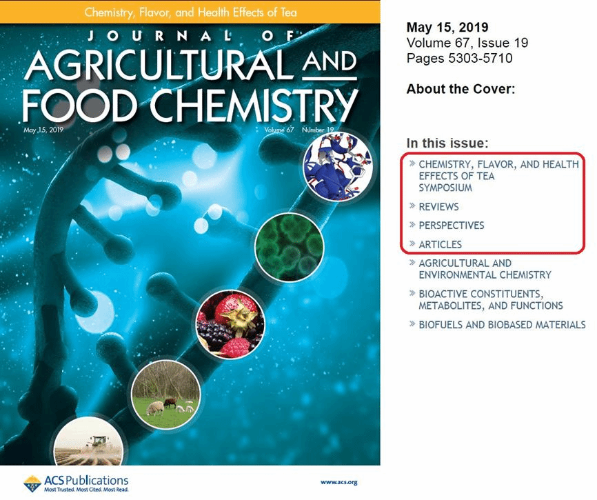 2018年8月我室与美国化学会农业与食品化学分会合作,在美国波士顿举办了“茶叶化学、风味及健康功能学术研讨会”。研讨会上,我室茶学相关研究成果获得与会专家的高度认可,经JAFC同行专家严格评议后,建议我室集中相关会议成果并以“茶专栏”形式出版。此次JAFC茶专栏收录的18篇文章中,标注教育部茶叶化学与健康国际合作联合实验室和茶学国家重点实验室为第一单位的文章有10篇。茶专栏的出版标志着我室国际合作联合实验室在“茶叶化学与健康领域”的相关研究成果得到了国际同行的广泛认可,必将进一步促进国际合作联合实验室的国际化建设,提升国际影响力。茶专栏相关链接见:https://pubs.acs.org/toc/jafcau/67/19