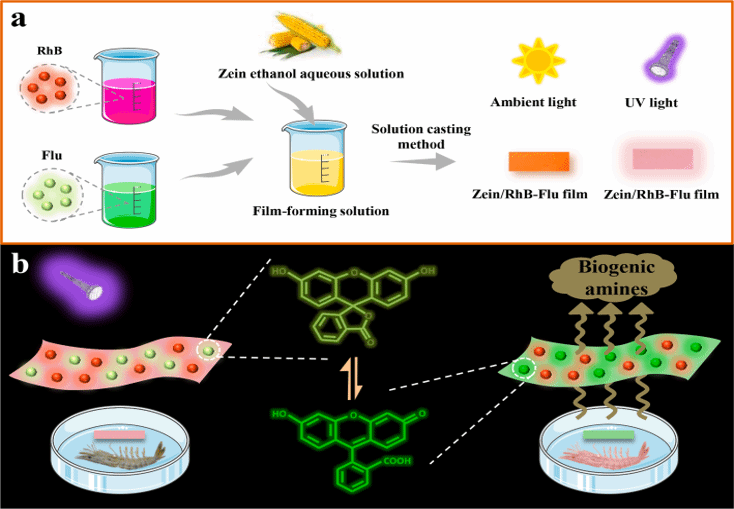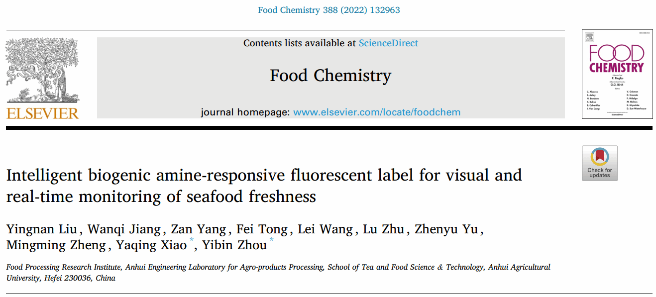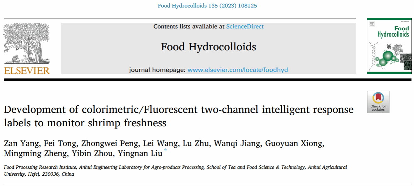 近日,食品科学领域权威期刊《Food Chemistry》(中科院一区,IF=9.231)和《Food Hydrocolloids》(中科院一区,IF=11.504)先后发表了我院刘英男教授的最新研究成果“Intelligent biogenic amine-responsive fluorescent label for visual and real-time monitoring of seafood freshness”和“Development of colorimetric/Fluorescent two-channel intelligent response labels to monitor shrimp freshness”。两项研究分别以玉米醇溶蛋白和高直链玉米淀粉为成膜基底,以荧光染料(荧光素、异硫氰酸荧光素)和天然色素(甜菜红)为智能响应因子,开发单模态和双模态的两种智能响应标签。基于荧光素/甜菜红的分子构象变化,该标签对于食品腐败产生的生物胺分子展现出灵敏的颜色响应,在紫外光/日光照射下呈现出肉眼可以识别的颜色变化。上述标签被成功应用于虾新鲜度的可视化实时监测。研究成果为新型智能响应标签的设计和开发提供了新思路,同时也为保障高蛋白食品的安全性提供了技术支持。