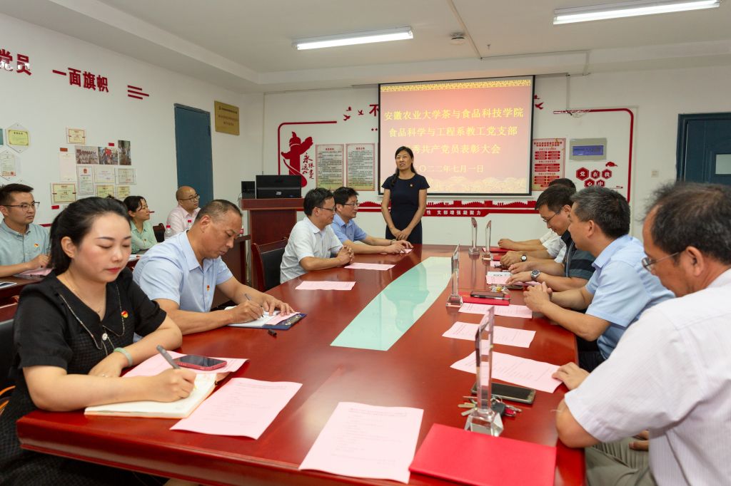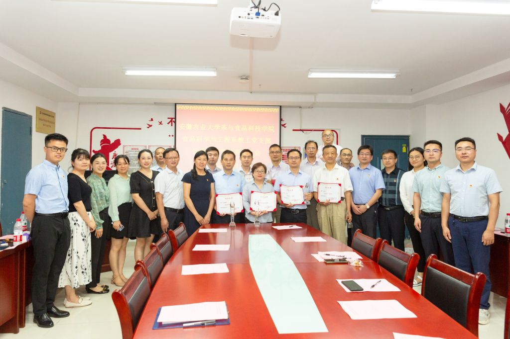 随后,茶与食品科技学院食品科学与工程系教工党支部对优秀共产党员进行表彰。党支部根据党员教师们在教学、科研、社会服务等方面突出业绩,为获表彰的党员教师制作了不同的颁奖词,现场播放他们的优秀事迹;与会领导分别为获得表彰党员颁发证书和奖杯。学院党委书记唐红萍在讲话中对食品科学与工程系教工党支部入选第三批全国党建工作样板支部培育单位、获得省级高校“双带头人”教师党支部书记工作室建设、安徽农业大学首批样板党支部、首批党支部书记工作室等称号表示祝贺,对获表彰党员同志在教学、科研、社会服务等方面做出的贡献和成绩给予肯定,同时希望党支部所有党员教师精诚团结、同心同德、扎实工作,持续发挥党员的优秀模范带头作用,为学校学院事业发展做出更大的贡献。