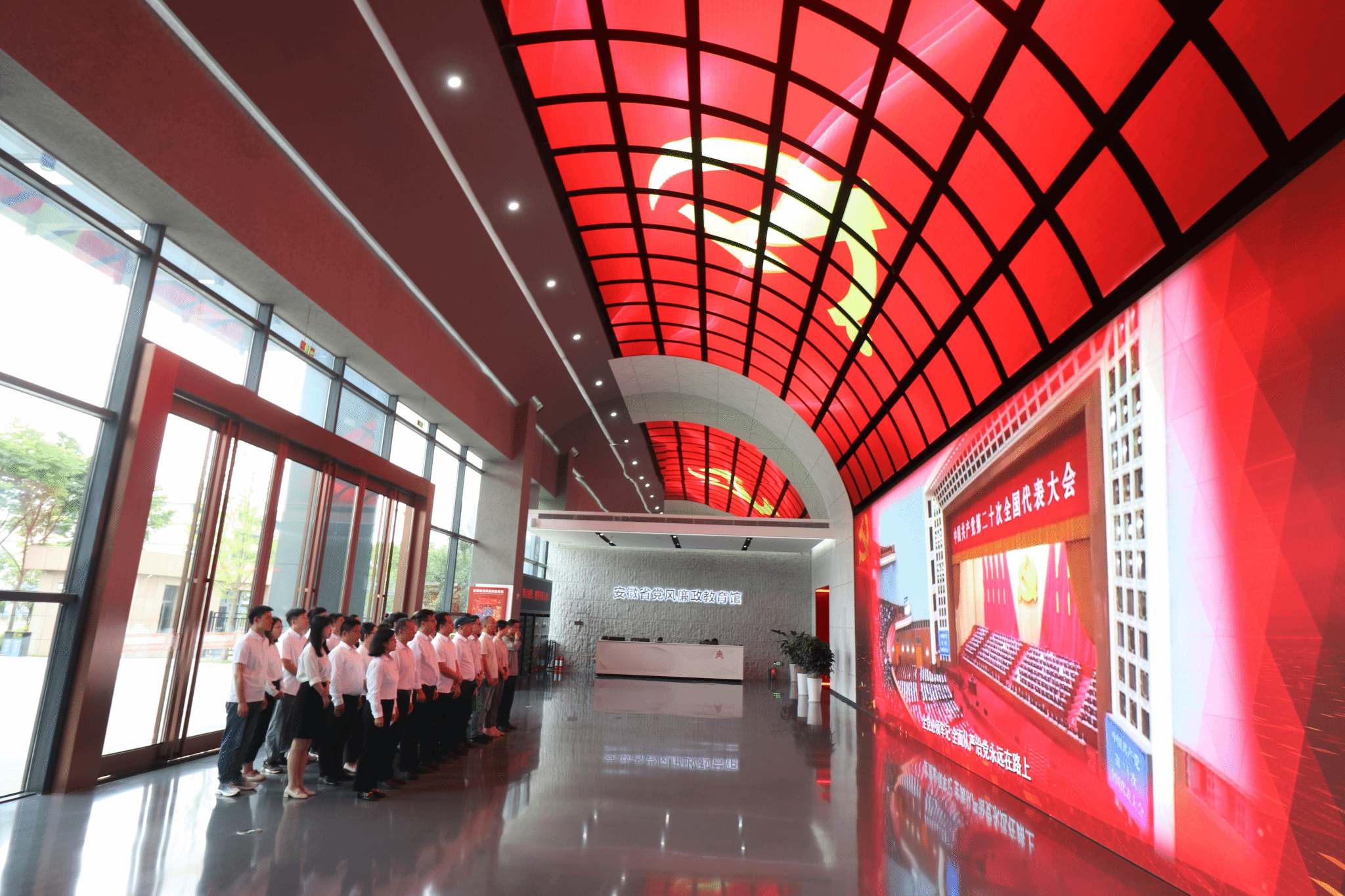 党员们首先观看了《永远在路上》警示教育专题片,随后通过展板、图片、视频、雕塑等多种形式,接受了“纪律立党·从严治党”、“廉润江淮·清风扬帆”、“以案为鉴·警钟长鸣”、“信领迷失·背弃理想”、“不忘初心·永葆清廉”五个专题教育,全面了解了安徽省尤其是十一届省委以来全面从严治党、党风廉政建设和反腐败斗争的成果。最后,大家面对鲜艳的中国共产党党旗,一起举起右手并紧握拳头庄严宣誓,在重温入党誓词中表达对党忠诚的坚定信念,践行遵守党的纪律、忠诚于党的事业的铮铮誓言。