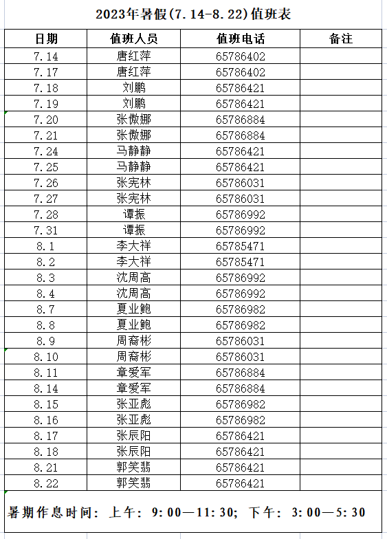 2023年暑假(7.14-8.22)值班表
