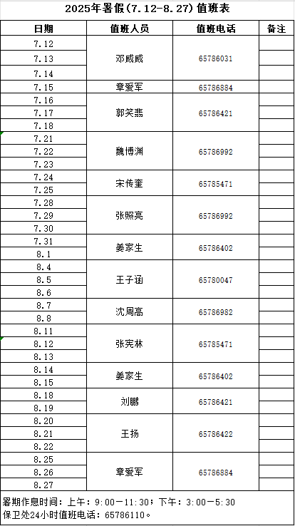 2025年暑假(7.12-8.27)值班表