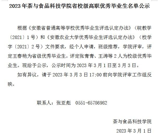 关于省级和校级高职优秀毕业生的公示