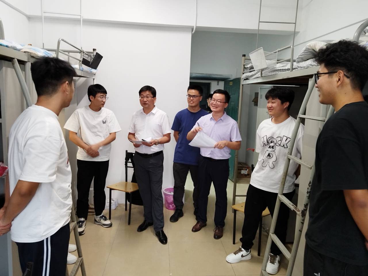 本网讯 9月7、8日,茶与食品科技学院迎来了2023级本科生和研究生。报到当天下午,院长李大祥、党委副书记沈周高及新生辅导员一行走访了新生宿舍,与新同学亲切交流,进行慰问,并给予学业和生活方面的指导。
