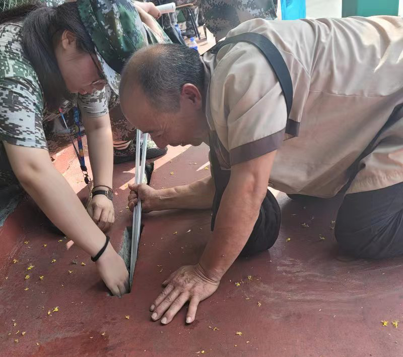 李师傅在确定好手机滑落位置后,不顾地上的尘土和污水,跪趴在地上小心翼翼地操作着手上的工具,不时改变姿势寻找合适角度。烈日炎炎下,李师傅早已汗流浃背,却仍然保持耐心,最终将手机从狭窄的缝隙中完好取出。