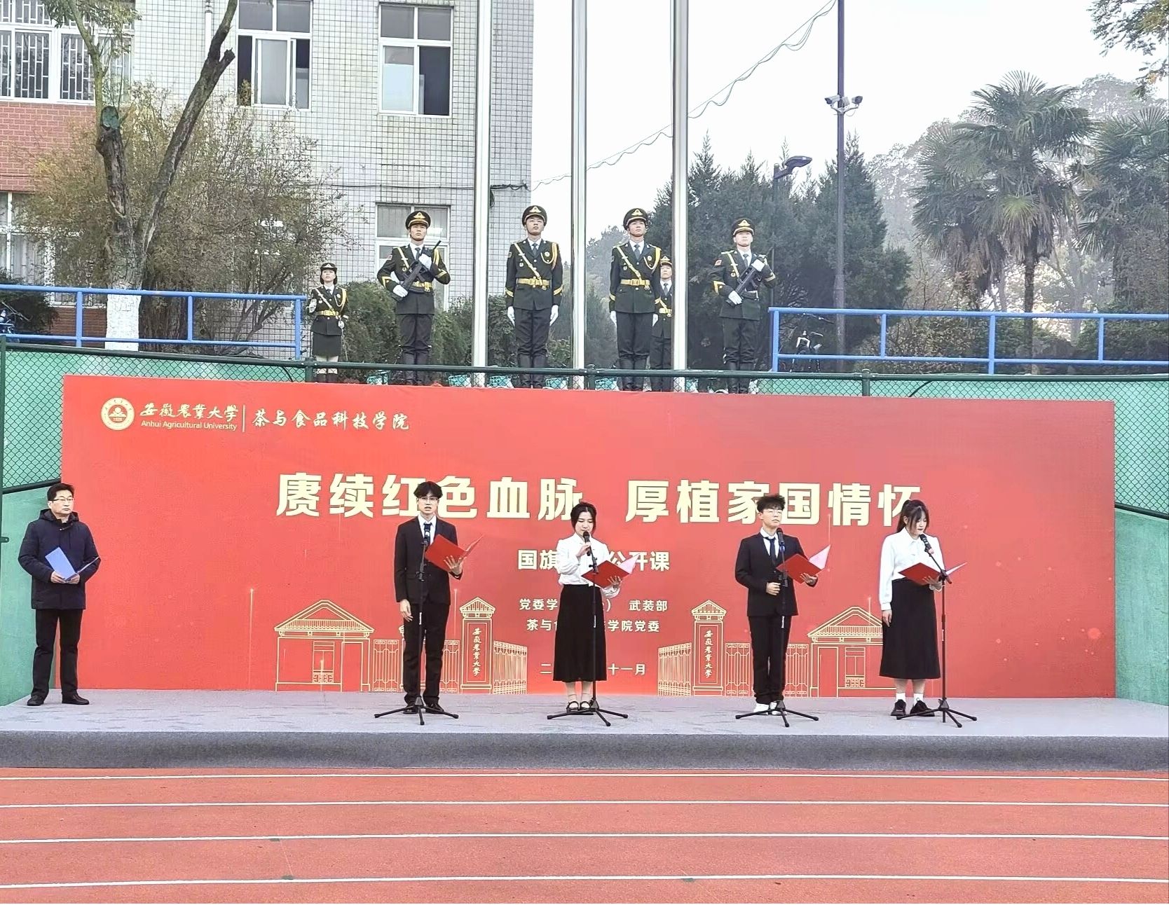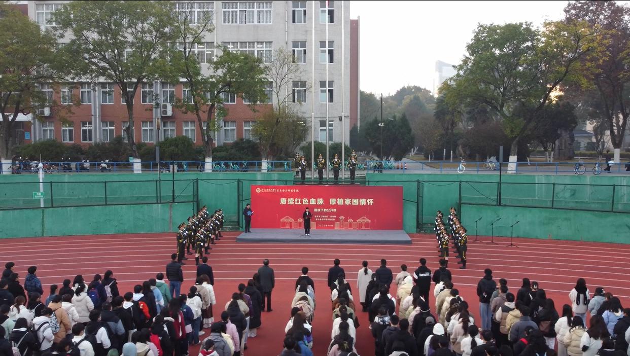 本网讯 11月27日,茶与食品科技学院举办“赓续红色血脉,厚植家国情怀”升旗仪式暨“国旗下的公开课”主题教育活动。校党委学工部、武装部负责人、学院党政领导、全体辅导员、2023级新生参加本次活动。活动由学院党委副书记、纪委书记沈周高主持。