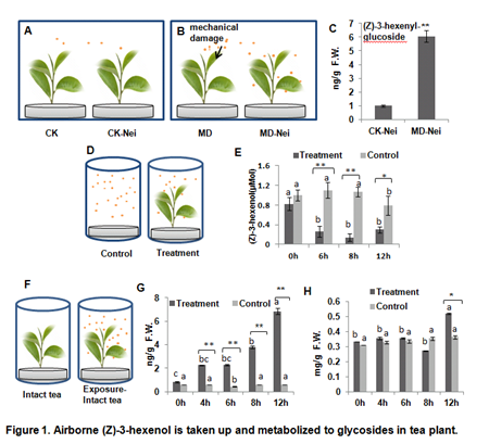 众所周知,植物在遭受植食性昆虫袭击时会释放挥发性物质,这些挥发物在介导害虫以及害虫天敌行为、触发受害植株与未受害植株间信息交流等方面具有关键作用。当未受害植株接触到受害植株释放的挥发物后,就会提前激发自身的防御响应,比如 (Z)-3-己烯醇就是一个能够介导植物间接防御响应的一种挥发物,然而,有关植物体如何识别这些具有通讯作用的挥发性化合物至今鲜有报道。在在本研究中,研究者通过体外模拟实验表明茶树能够吸收外源施加的或邻近受到侵害的茶树释放的(Z)-3-己烯醇分子,并在体内转化成(Z)-3-己烯醇糖苷这一防御武器;该研究进一步通过多组学关联分析,体外酶活性分析、定点突变分析、异源转基因分析发现,茶树能够吸收外源(Z)-3-己烯醇并在体内将其糖苷化,进而起到防御害虫的作用,同时首次在茶树中发现并验证了控制这一糖苷化的关键酶基因。该研究结果不仅为通过喷施(Z)-3-己烯醇这一化学诱导剂对茶园病虫害进行生物防治提供理论依据,也为茶树病虫害的防治提供了一种新的思路和策略。人们可以利用这一结果,人们可以通过外源喷施一定量的(Z)-3-己烯醇,提升茶园的防御能力,该结果对其他植物病虫害防御机制揭示中也具有一定的借鉴作用。