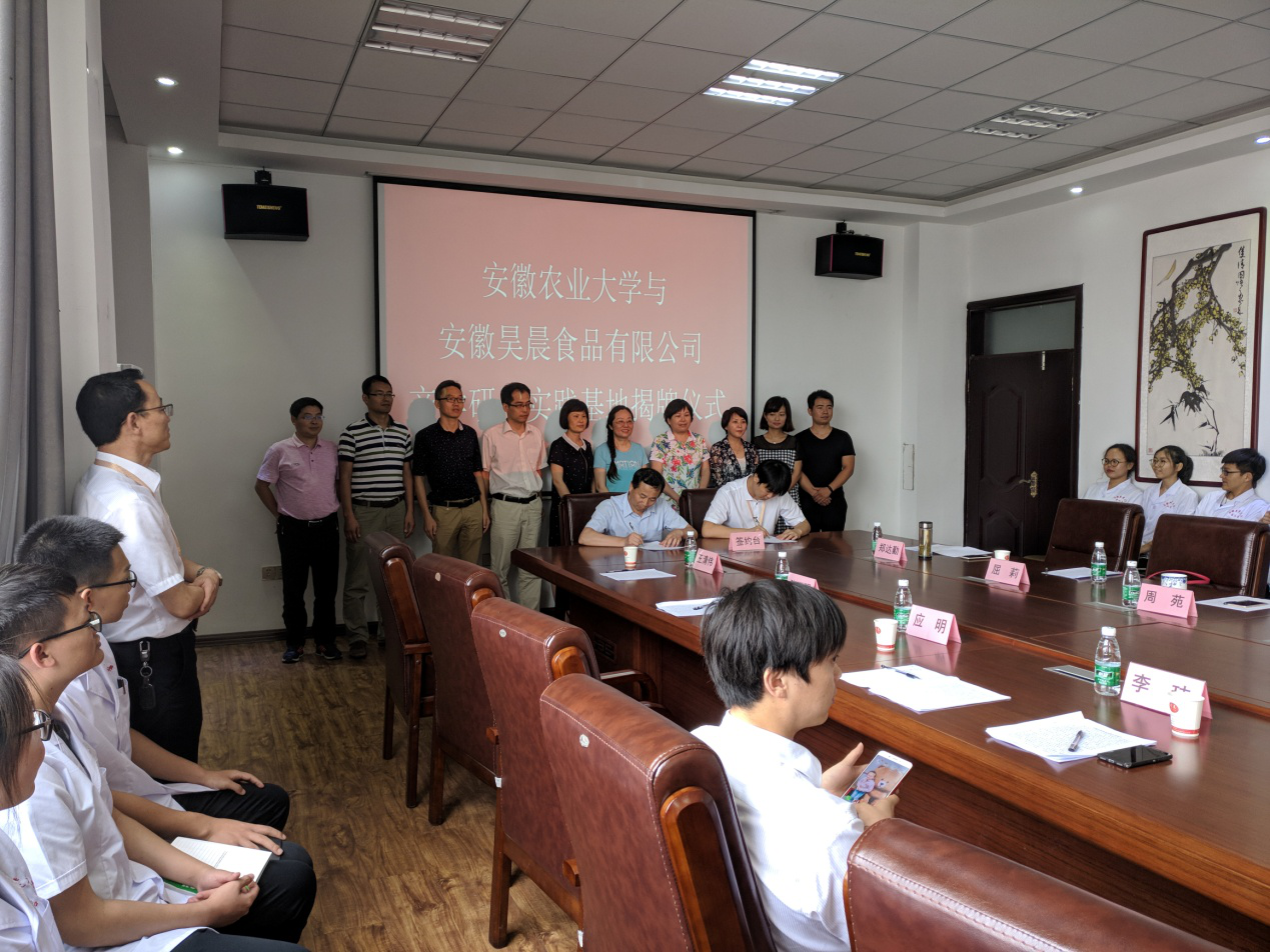安徽昊晨食品有限公司成立于2012年9月,是一家集科研、粮食贸易、存储、食品加工、销售于一体的高新技术企业。公司占地面积160亩,总投资2.6亿元,年加工面粉生产能力20万吨,年小麦收储能力达25万吨。公司十分重视这次与我校的产学研用合作,对前期我校参加生产实习的21名师生做了精心的安排和接待,在学习和生活上提供良好的保障和服务,得到老师和同学们的高度认可。公司上下对此次签约和揭牌仪式做了细致的准备,会议邀请了濉溪县分管文科教的副县长任婷,淮北市科技局副局长马广梅,县委组织部科长曲莉等参加,签约仪式由科技局王开东科长主持,公司中层以上领导,技术骨干以及所有实习师生参加会议,李玮副处长代表学校,崔云书记代表学院分别在签约仪式上发言讲话,随后,周裔彬副院长代表学院与公司董事长孙超签订产学研用合作协议,签约仪式结束后共同为基地揭牌并合影留念。
