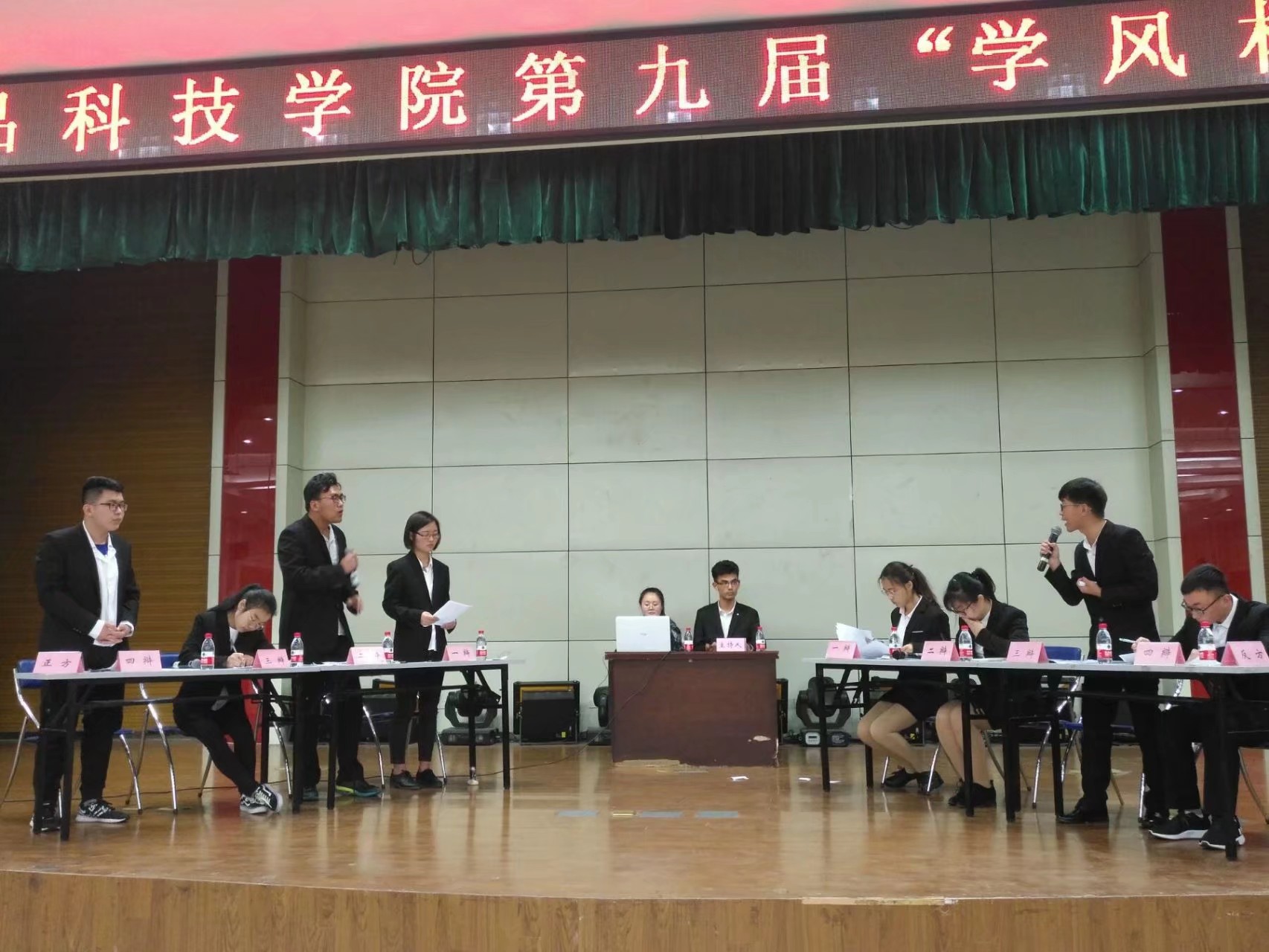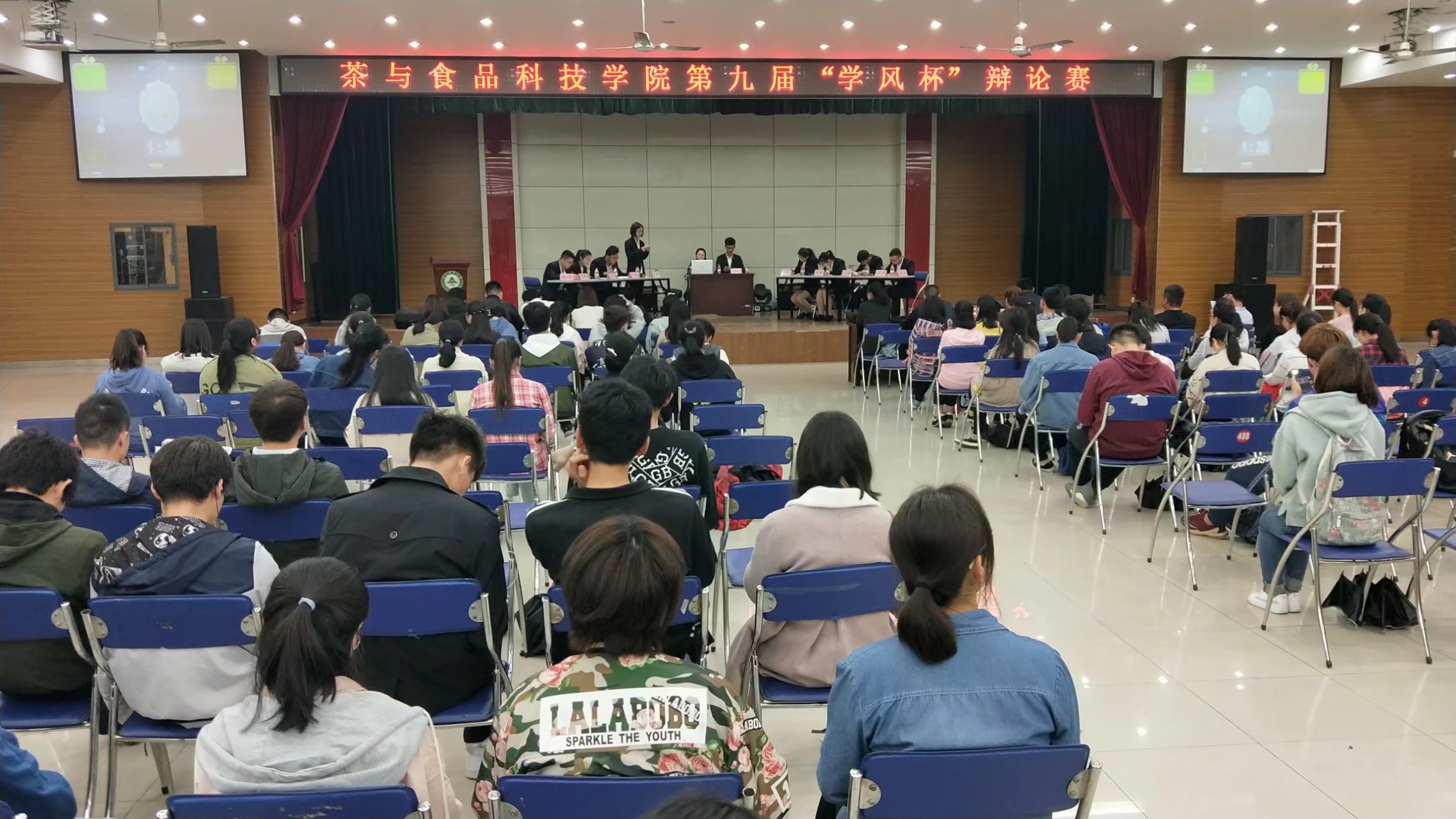 本网讯4月13日晚,茶与食品科技学院第九届“学风杯”新生辩论赛在欣苑四楼小礼堂圆满落幕。决赛现场邀请了校学生辩论队主要骨干担任评委,学院党委副书记副院长张国学、院团委老师参加活动并为获奖选手颁奖。