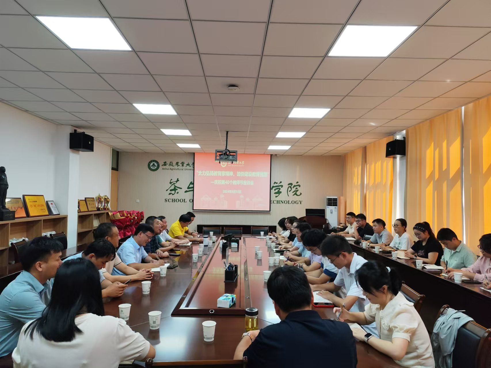 本网讯 9月10日上午,茶业学院和食品与营养学院庆祝教师节大会暨教师代表座谈会在茶业楼221会议室举行。茶业学院和食品与营养学院两个学院领导班子成员、优秀教师代表、新进教师参加了会议。座谈会由茶业学院党委书记姜家生主持。