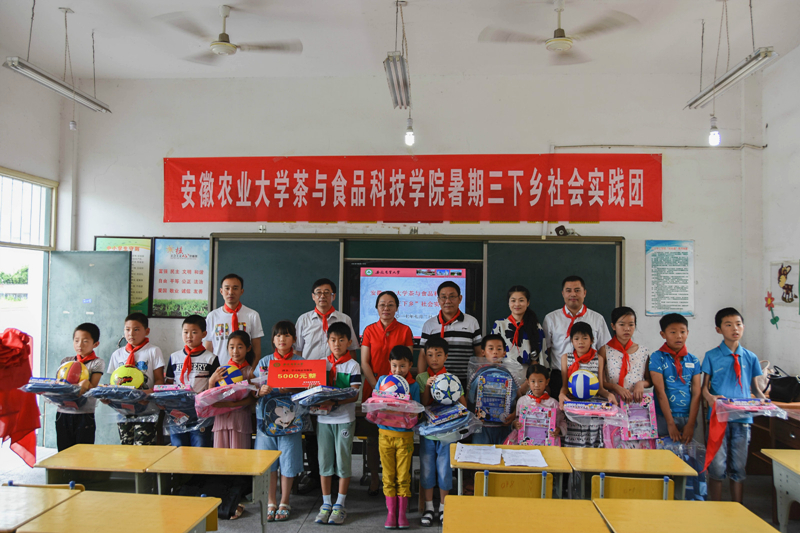 、副校长盛红贵等人出席了会议。殷朝晖校长代表学校致欢迎词,他对安徽农业大学学生的爱心支教表示欢迎,对农大给予小学的支持与帮助表示感谢。院党委书记崔云勉励参加支教的同学珍惜机会,沉下心来,真正为留守儿童做实事;同时,也希望留守儿童能够克服困难,努力学习,做一个对社会有用的人,为祖国的发展做出贡献。任琪老师对青年大学生社会实践提出了希望和要求,黄山区副区长孙长应代表黄山区政府对大学生暑期实践团的到来表示欢迎,并希望通过三下乡活动开展,进一步促进安徽农业大学和黄山区的产学研创等合作的多层次对接。启动仪式上双方领导共同为茶与食品科技学院捐赠的“爱心图书屋”揭牌,并向留守儿童发放价值5000余元的图书、学习和体育用品等物资。
