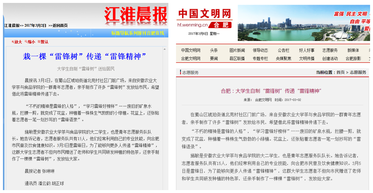本网讯 为进一步弘扬“奉献、友爱、互助、进步”的志愿服务精神,更好地展现安农学子形象,在雷锋日来临之际,茶与食品科技学院积极开展“寻觅雷锋足迹,弘扬奉献精神”学雷锋主题系列活动。