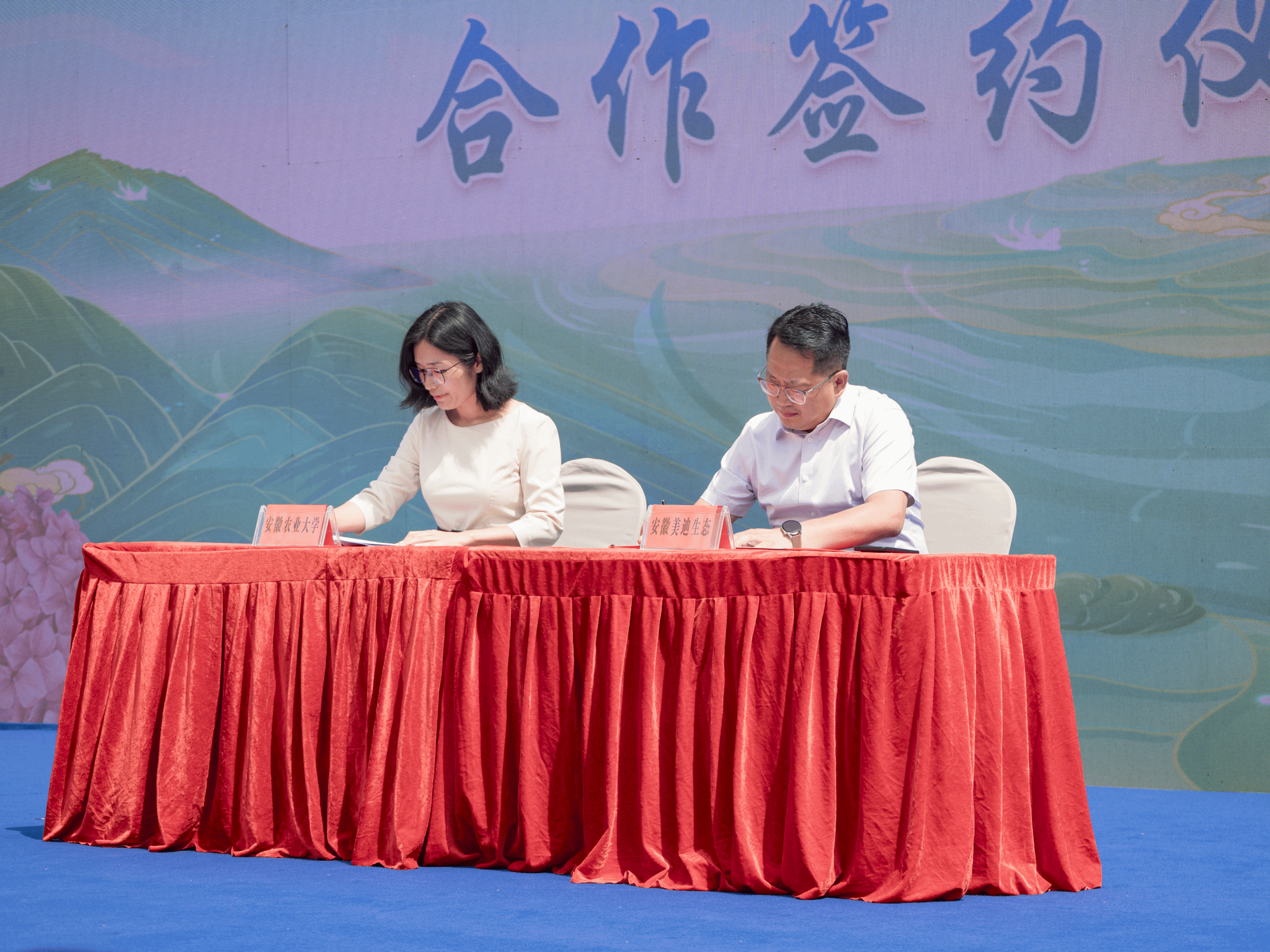 本网讯 4月30日,安徽农业大学茶树种质创新与资源利用全国重点实验室与安徽郎溪美迪生态农业有限公司合作协议签订暨“安徽郎溪花茶科技小院”揭牌仪式在郎溪美迪花卉节举行。郎溪县委常委、宣传部部长、建平镇党委书记杨娟、茶业学院党委书记姜家生、我院专家代表胡绍德、刘琳琳、陈琪、毕海军出席揭牌仪式。
