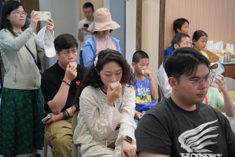为了让大家获得更为直观和深切的感受,活动特别设置了茶品鉴体验环节与讲座内容相呼应。徐千懿精心挑选了能够代表不同历史时期审美的茶样,指导现场师生们通过静嗅茶香、慢品茶汤,充分调动身体感官,亲身体验了不同审美框架下茶叶所呈现出的独特香气、滋味与气韵。这种沉浸式的体验,仿佛在师生们眼前展开了一幅流动的画卷。大家真切地感受到,从唐代崇尚自然的审美,到宋代研膏茶的权力美学,再到明清炒青散茶的回归自然,茶汤中的审美意趣随着时代流转而不断演变。通过理论与品鉴的结合,讲座所强调“中华茶叶千年嬗变的审美脉络与人文精神”的主旨,变得生动可感,深入人心。
