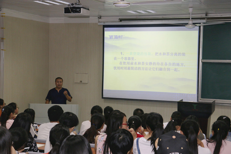 安徽茶绎空间茶叶有限公司总经理余小超先生首先介绍了公司的生产经营情况、企业文化、管理理念和目标追求。他从专业的角度对本次大赛的主题、具体要求进行了剖析和讲解,提醒同学们注意包装和LOGO设计要具备生产实用性。随后,进入答疑解惑环节,同学们表现出浓厚的兴趣并纷纷提出自己对产品设计的困惑。“冷泡茶能否实现?”“茶叶在瓶中如何避光?”“随着瓶中茶叶浸泡时间的变长口感会有变化该如何解决?”“即饮茶产品主要面向的群体是哪些,价格如何定位?”等问题余小超先生都一一做了解答。精彩的宣讲视频、热烈的互动交流,将本次宣讲会的气氛推向一个又一个高潮。