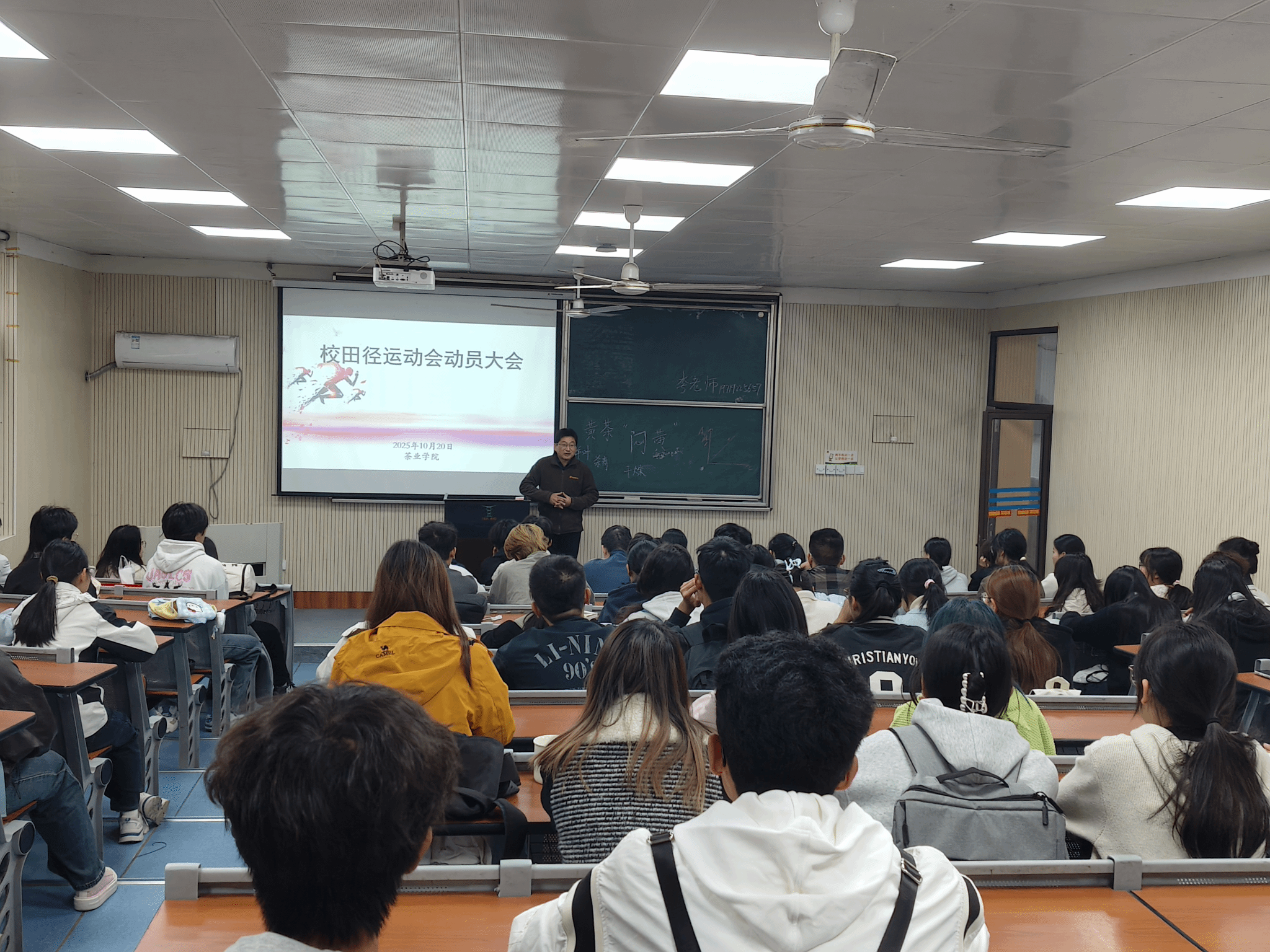 本网讯 10月20日,为鼓舞士气、迎接即将到来的校运动会,学院在茶业楼1992教室召开了运动会动员大会。学院党委副书记沈周高、院团学负责老师、志愿者以及全体运动员参加此次会议。