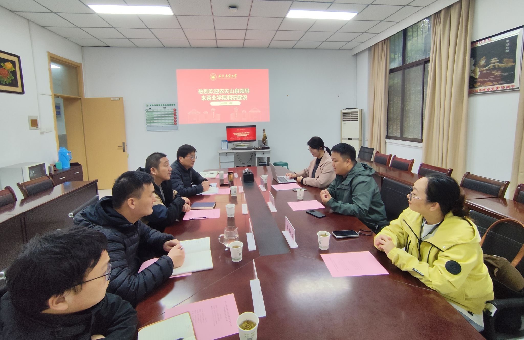 本网讯 11月17日下午,茶业学院与农夫山泉校企合作调研座谈会在茶业楼114室举行。学院党委书记姜家生、副院长张照亮等领导教师,以及农夫山泉总部人事经理吴东冬等企业代表参会,此次座谈会由学院党委副书记沈周高主持。