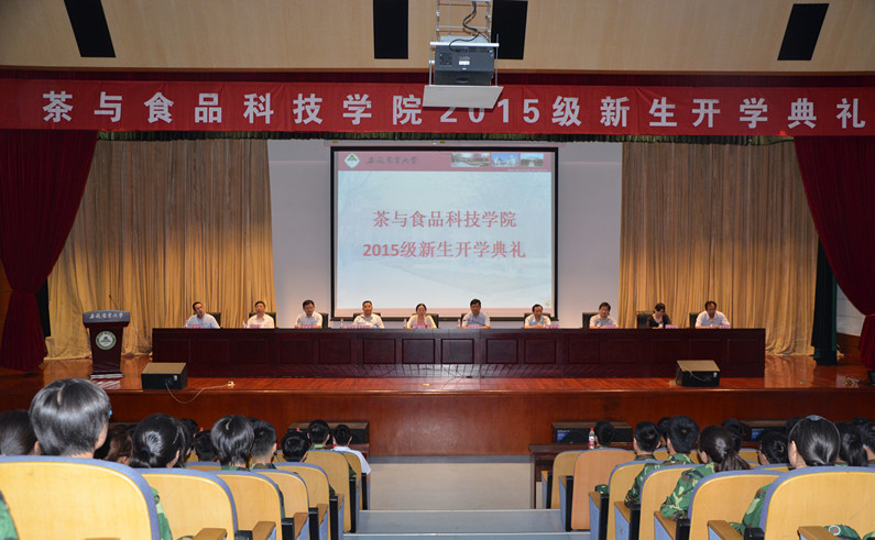 本网讯 9月9日下午,茶与食品科技学院2015级新生开学典礼在图书馆第一报告厅举行。学院党政领导、各专业负责人、新生班主任以及全体新生齐聚一堂,共同见证这庄严的一刻。典礼由我院党委副书记、副院长张国学主持。