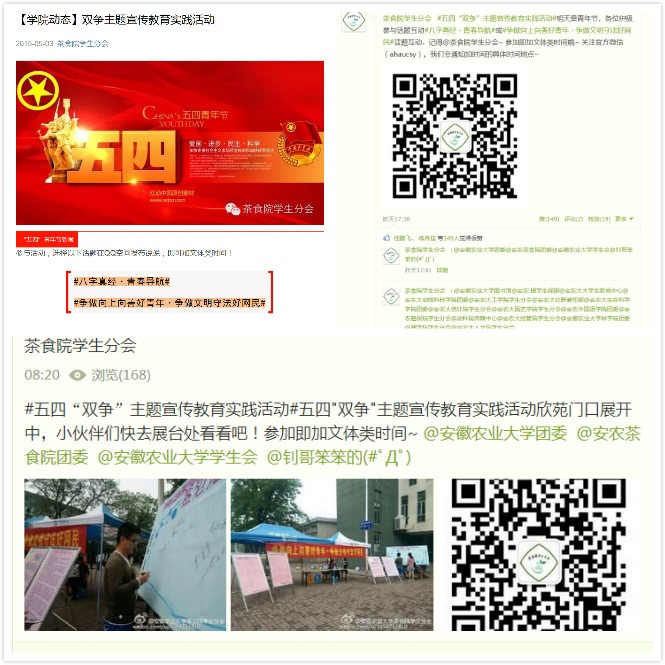 活动现场,同学们以海报、宣传单页的形式向全校师生集中展出了《“清朗网络•青年力量”倡议书》、2015年合肥青年五四奖章候选人事迹及2014年我校十大感动校园人物事迹,以“争做向上向善好青年·争做文明守法好网民”为主题制作展示了签名墙,并以“八字真经·青春导航”、“清朗网络·青春力量”为话题进行了线上线下的互动学习交流。活动以一次文明倡议、一次学习成长、一次话题交流以及一次签名承诺为载体,引导广大同学积极参与、主动学习、激发强劲青春正能量,得到了同学们的广泛关注和积极反响。