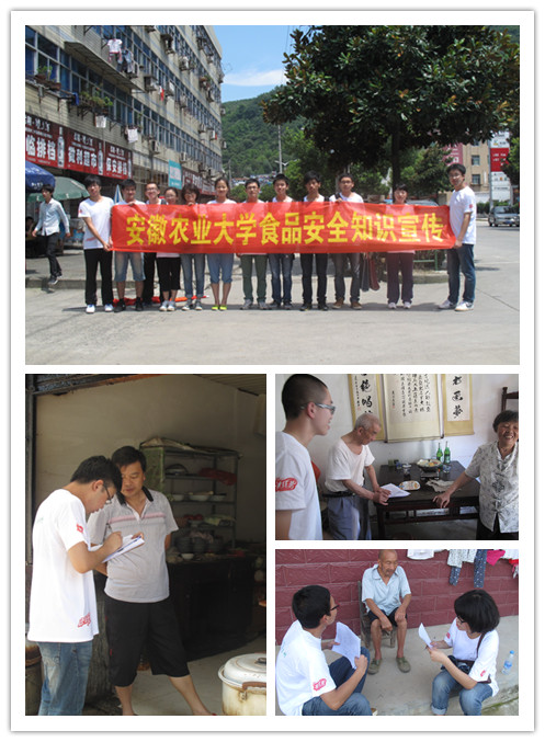 本次实践活动,服务团将宣传食品安全科普知识与和谐小城镇建设相结合,在金寨县梅山镇开展了食品安全宣传活动。各分队通过发放宣传资料、问卷的方式走进乡间集市,深入街道社区,开展食品安全科普知识宣讲活动。队员们耐心地向群众介绍一些实用、贴近生活的食品安全知识。例如,如何鉴别毒大米、毒酱油、毒胶囊,地沟油的识别,不同种类牛奶的正确选择与保存,夏季各类慎吃的食物,街头不卫生的熟食等等,较大程度提高了当地群众的食品安全意识和责任意识,收到了良好的效果。