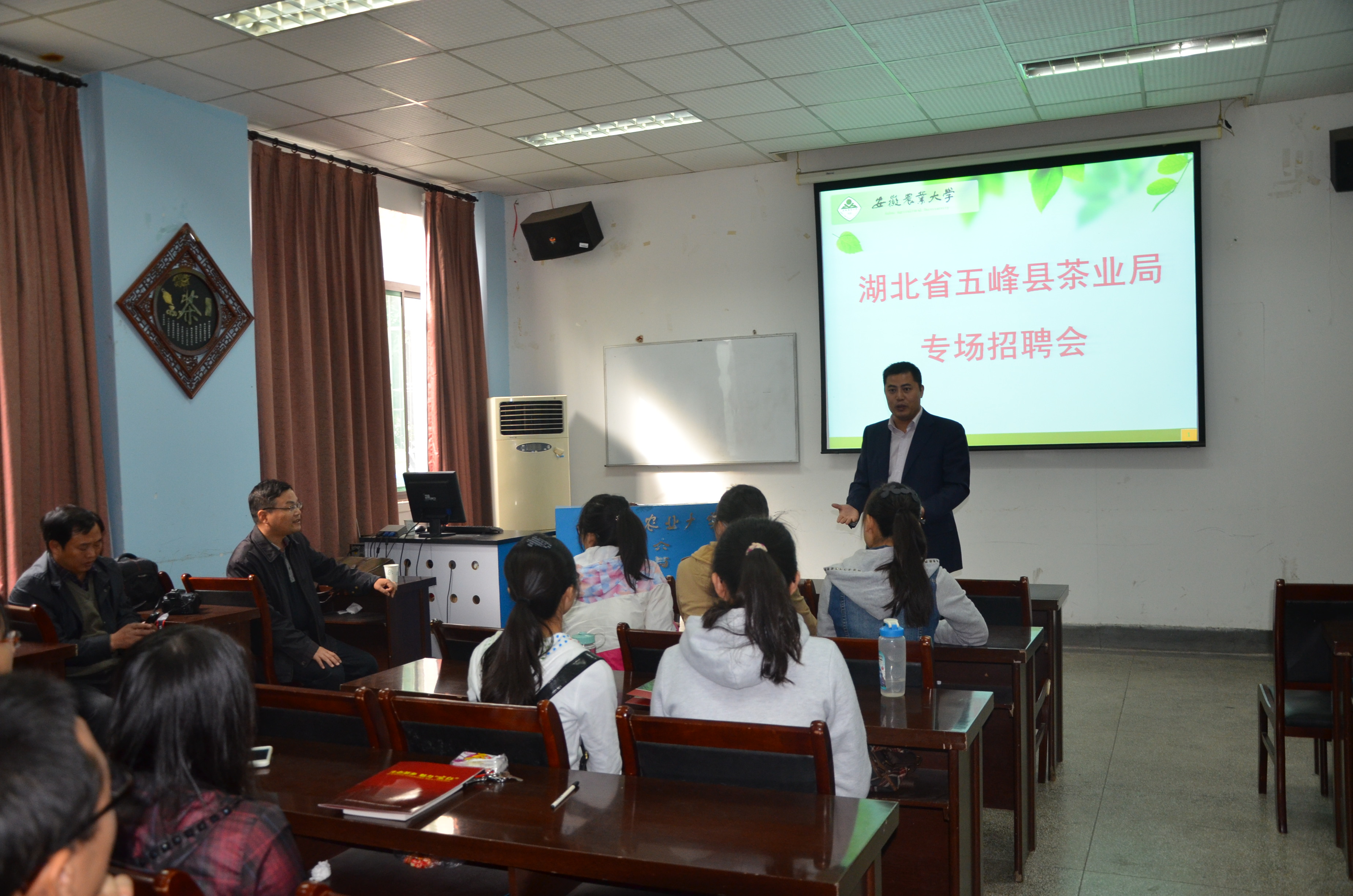 湖北省五峰县产茶历史悠久,是湖北名茶大县和“中国茶叶之乡”,也是“宜红茶”的故乡。为充分利用茶叶资源,壮大绿色产业,打造茶叶品牌,五峰县茶业局此次也是专门来我院进行人才引进招聘工作。学院党政领导表示,将以此次招聘会为契机,进一步加强与五峰县茶业局在教学科研、人才培养、毕业生就业等方面的合作和交流。(张奎 通讯员:陈娟)