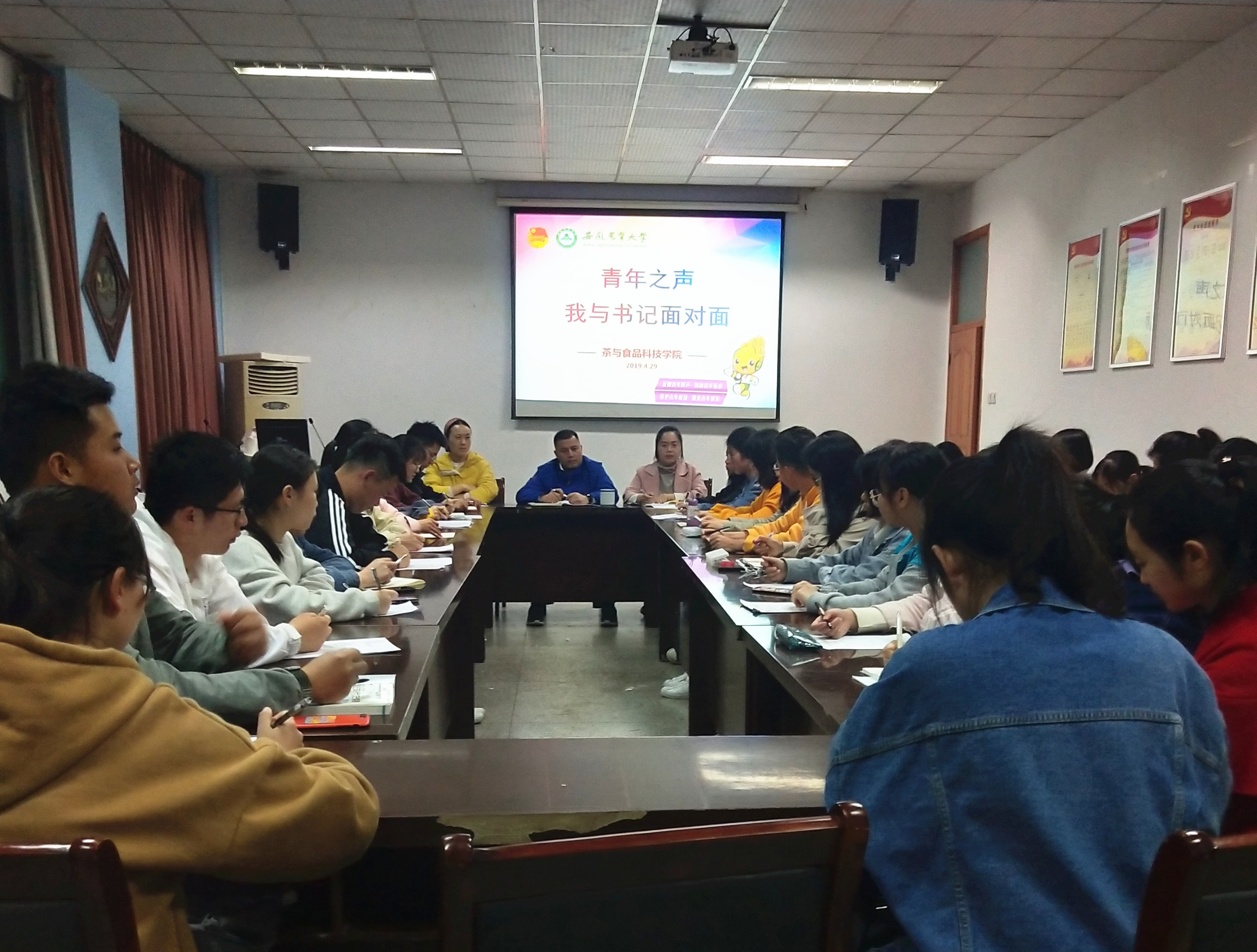 4月29日,茶与食品科技学院在茶业楼105室开展“纪念五四运动100周年”专题学习暨我与书记面对面活动。学院党委副书记、纪委书记、副院长张国学、办公室老师及各专业学生代表参加此次会议,会议由学院团委老师主持。