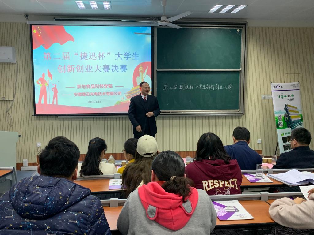 本网讯 3月13日,茶与食品科技学院第二届“捷迅杯”大学生创新创业大赛决赛暨颁奖仪式在茶业楼1992室精彩举行。安徽捷迅光电技术有限公司行政副总经理高光楷、学生公寓小区管理中心主任胡启涛、校团委副书记任琪,学院党委书记崔云、院长张正竹、副书记兼副院长张国学、副院长周裔彬、副院长李大祥等出席并担任大赛评委。