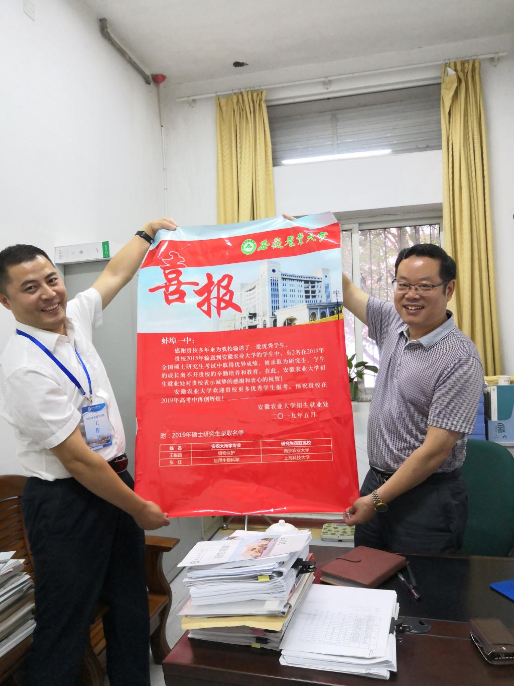 学院高度重视招生宣传工作,6月初学院专门召开会议研究部署年度招生工作。学院保持与生源基地中学互动对接,并通过送喜报上门、邮寄资料方式,把学校宣传资料、考研喜报等送给了长丰一中、巢湖槐林中学、烔炀中学,也取得了良好效应。(张奎)