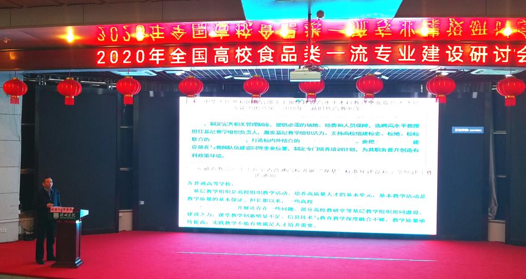 本网讯 为了进一步深入贯彻落实全国教育大会精神和新时代全国高等学校本科教育工作会议精神,持续推进一流专业“双万计划”,做强一流本科、建设一流专业、培养一流人才,全面振兴本科教育,提高人才培养能力,实现高等教育内涵式发展。10月31日至11月2日,教育部高等学校食品科学与工程类专业教学指导委员会2020年全国高校食品类一流专业建设研讨会在滁州学院召开,我校以及安徽省食品专业合作委员会作为本次研讨会协办单位,茶食学院党委书记唐红萍、专合委主任杜先锋教授、教学副院长周裔彬教授、食品科学与工程系主任薛秀恒副教授、合肥市农产品加工研究院副主任梁进副教授以及食品系骨干教师汪名春副教授参会,全国90所拥有食品专业的高校500名教师参会并交流研讨,安徽教育厅高教处副处长朱永国到会指导并讲话。