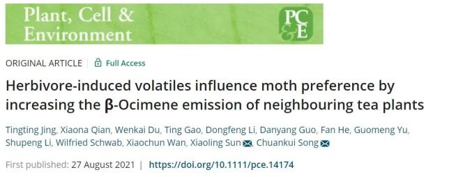 近期,我院茶树生物学与资源利用国家重点实验室宋传奎教授课题组和中国农业科学院茶叶研究所孙晓玲研究员课题组合作在国际知名期刊Plant, Cell & Environment(影响因子7.228)发表了题为“Herbivore-induced volatiles influence moth preference by increasing the β-Ocimene emission of neighbouring tea plants”的研究论文,该研究发现被茶尺蠖幼虫取食诱导的挥发物可激发邻近茶树β-罗勒烯的释放,进而提高邻近健康茶树对茶尺蠖成虫的驱避能力。这一研究将有助于深入认识植物挥发物的生态功能,拓展对挥发物介导的植物间信号交流机制的新认识。