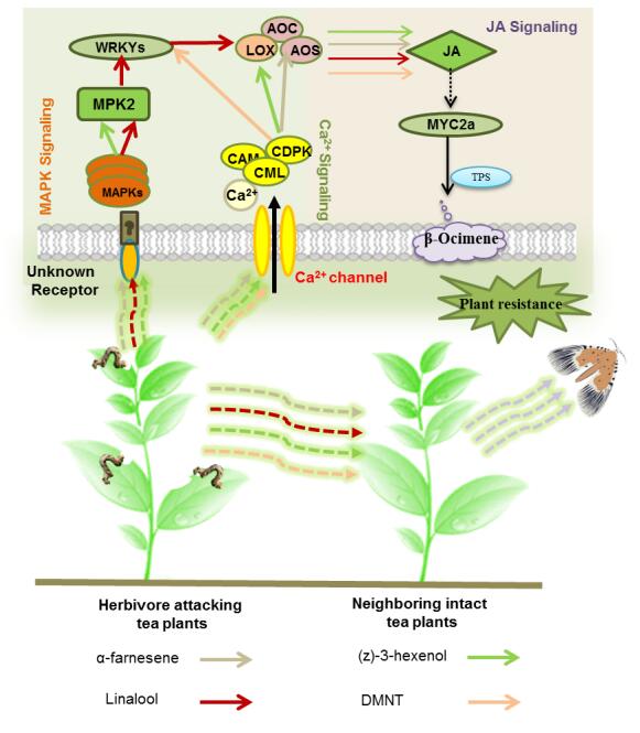 在本研究中,课题组发现茶树在被茶尺蠖幼虫取食时,会释放多种挥发性物质,这些物质可提高邻近植株对茶尺蠖成虫(特别是交配后的雌虫)的驱避能力。通过进一步对临近健康茶树释放的挥发物的定性定量分析,结合茶尺蠖成虫行为分析,发现β-罗勒烯在其中发挥重要作用,结果表明:茶树在被茶尺蠖取食时释放的 (顺)-3-己烯醇、芳樟醇、α-法尼烯和萜烯同系物DMNT可激发临近植株β-罗勒烯的释放。研究团队继续通过关键通路抑制实验,结合特定挥发物暴露实验,发现被幼虫取食释放的挥发物可通过Ca2+和JA信号通路激发临近健康茶树β-罗勒烯的释放。该研究揭示了挥发物介导的植物间信号交流新机制,对开发茶树害虫绿色防控及新型农作物虫害防治策略具有重要参考价值。