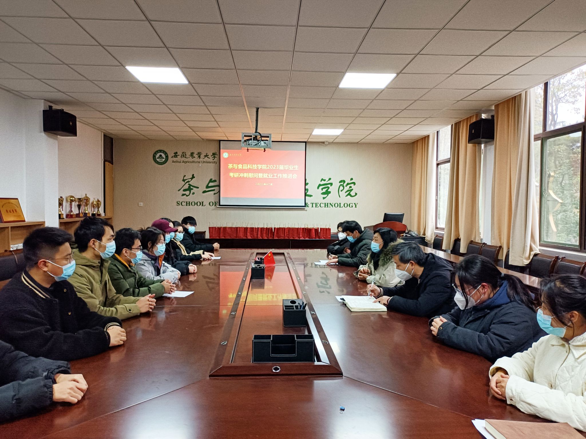 本网讯 研途在望,关爱同行。为进一步做好2023届考研和就业工作,帮助毕业生高质量升学、就业,12月16日下午,茶与食品科技学院在茶业楼221会议室召开2023届毕业生考研冲刺慰问暨就业工作推进会。学院党委书记唐红萍、2023届毕业班辅导员及毕业班学生代表参加会议,会议由学院党委副书记夏业鲍主持。