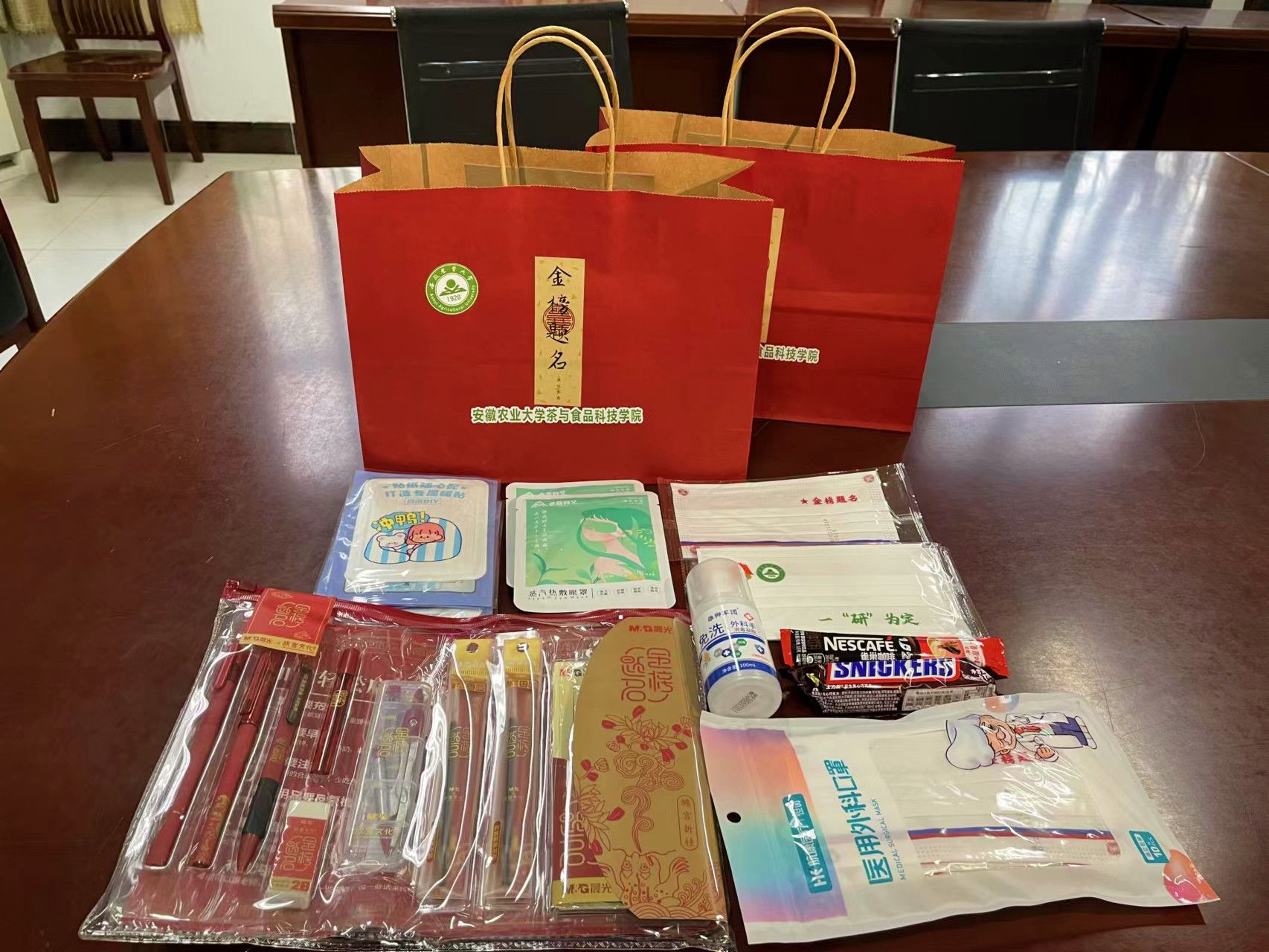 随后,学院领导老师们为考研学生发放了考试套装、医用口罩、酒精消毒液、眼贴、暖宝宝、咖啡、士力架等考研“暖心包”慰问品,饱含学院领导、老师们对广大考生诚挚的祝福。