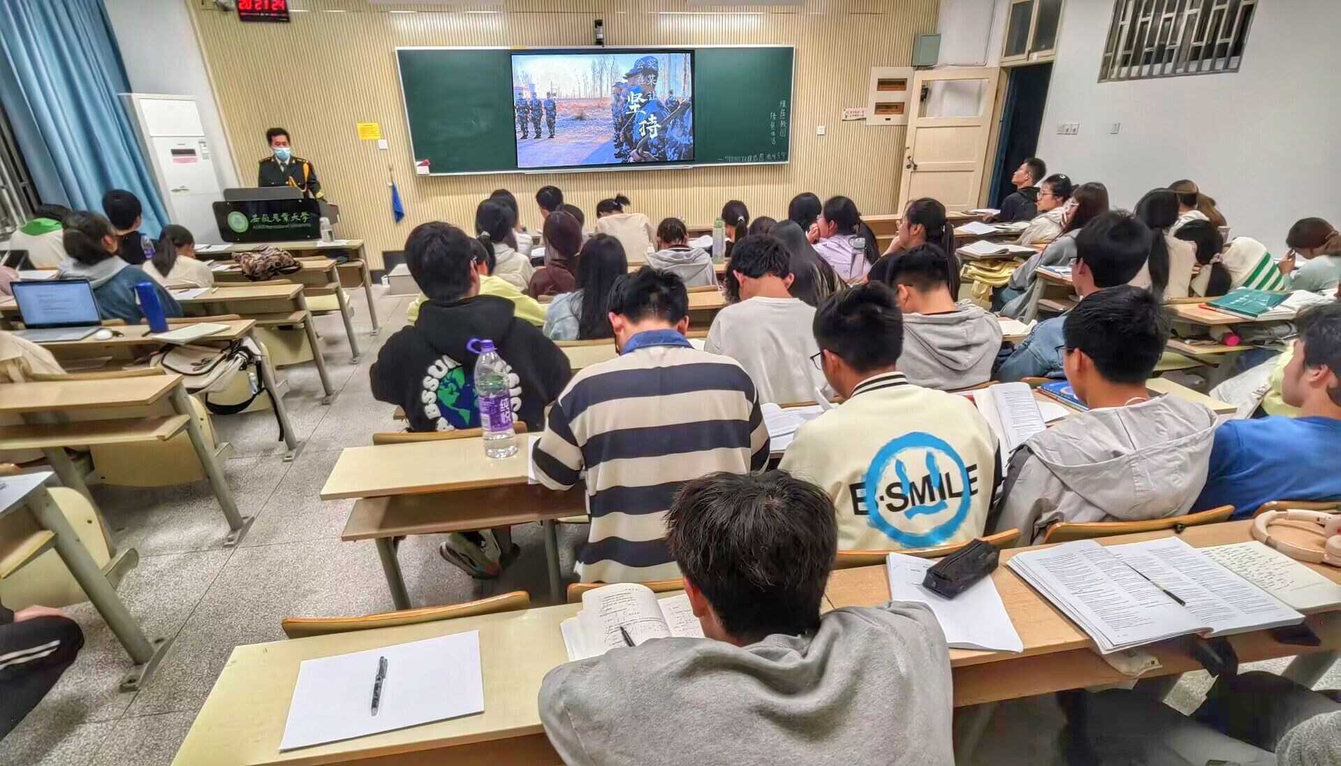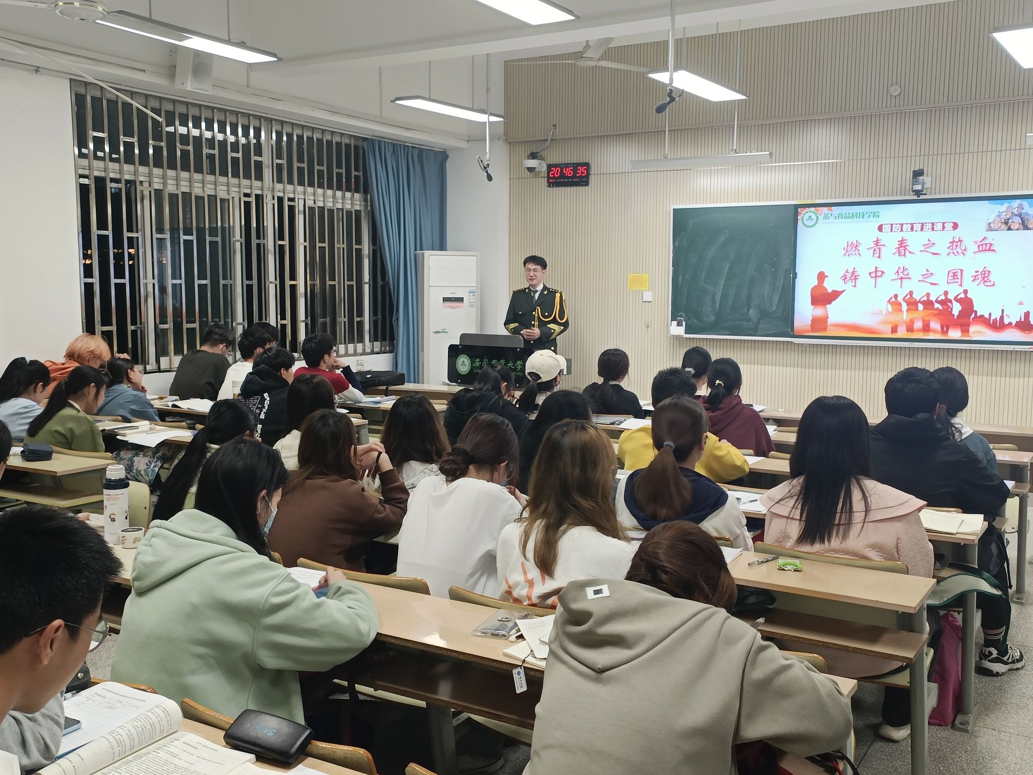 本网讯 为深入贯彻党的二十大精神,普及国防知识,增强国防意识,弘扬爱国主义精神,4月10日晚,茶与食品科技学院举办“燃青春之热血,铸中华之国魂”退伍士兵进课堂开展国防宣讲教育活动,优秀退伍士兵、校国旗护卫队训队员代表走进晚自习教室,开展国防教育宣讲,受到新生们热烈欢迎。