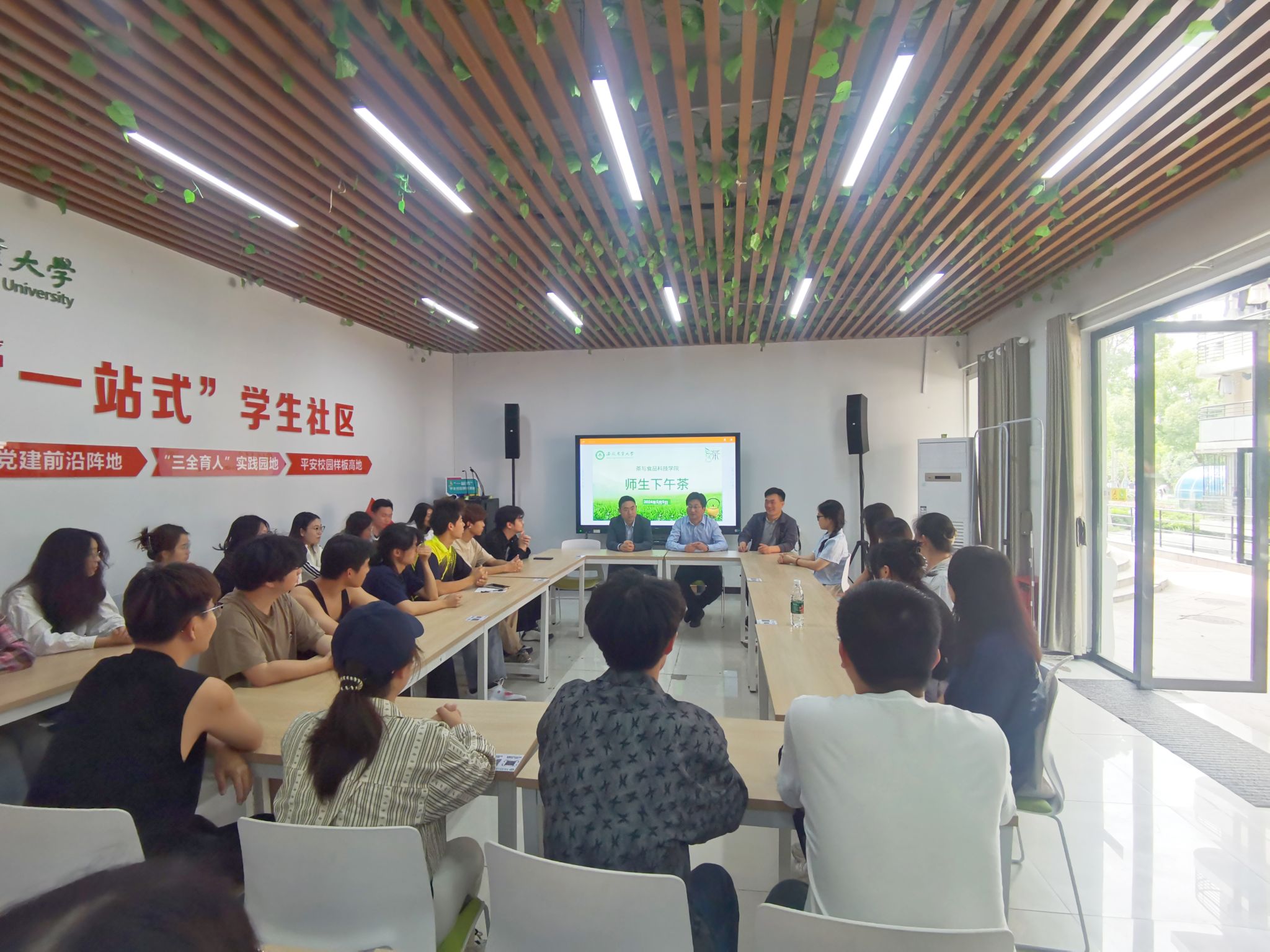 本网讯 5月9日下午,茶与食品科技学院在“一站式”学生社区举办“青年之声·面对面——师生下午茶”活动。学院党委副书记沈周高、副院长张照亮、副院长梁进,以及23级本科生和23级研究生代表参加了此次活动。活动由沈周高主持。