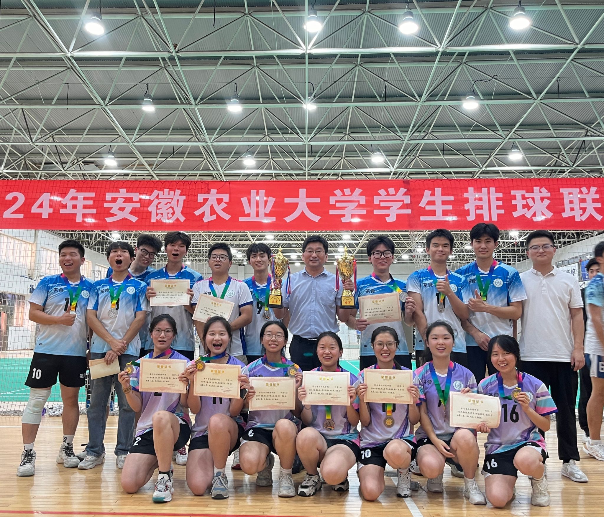 本网讯 6月20日,2024年安徽农业大学学生排球联赛落下帷幕,经过激烈角逐,茶与食品科技学院的健儿们展现了非凡的竞技实力和团队精神,荣获男排亚军与女排季军的双重荣誉。