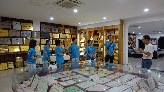 实践的第三站,团队来到太平猴魁领军企业“猴坑茶业”。自创立伊始,猴坑茶叶有限公司便深耕于太平猴魁茶这一领域,集种植之精粹、加工之匠心与推广之智慧于一体。在参观过程中,团队荣幸地获得了与猴坑茶业传承人方丽彦女士面对面交流访谈的机会。方丽彦女士从猴坑茶业的历史发展、太平猴魁的产业现状、个人经验以及企业未来规划等维度展开详细的介绍,为本次实践活动提供了新的视角——面对竞争日益激烈的市场环境,传统茶企也在探寻进一步开发年轻消费者市场的路径,卡通IP“方小魁”、各类文创以及茶衍生品开发、新式茶饮的探索,都成为猴坑茶业在传统和创新的试卷中给出的回答。但由于难以机械化生产、人工成本大,太平猴魁在拓宽产业链上仍受到很大的限制,这是太平猴魁现阶段面临的最大的挑战,也是产业发展的一个突破口。通过这次访谈,团队成员深切感受到猴坑集团对品质追求的极致严苛以及对传统文化的深切尊重,更有幸与传统茶叶企业在传统与现代交织的社会进程中勇于探索、不断前行的坚定步伐同频。