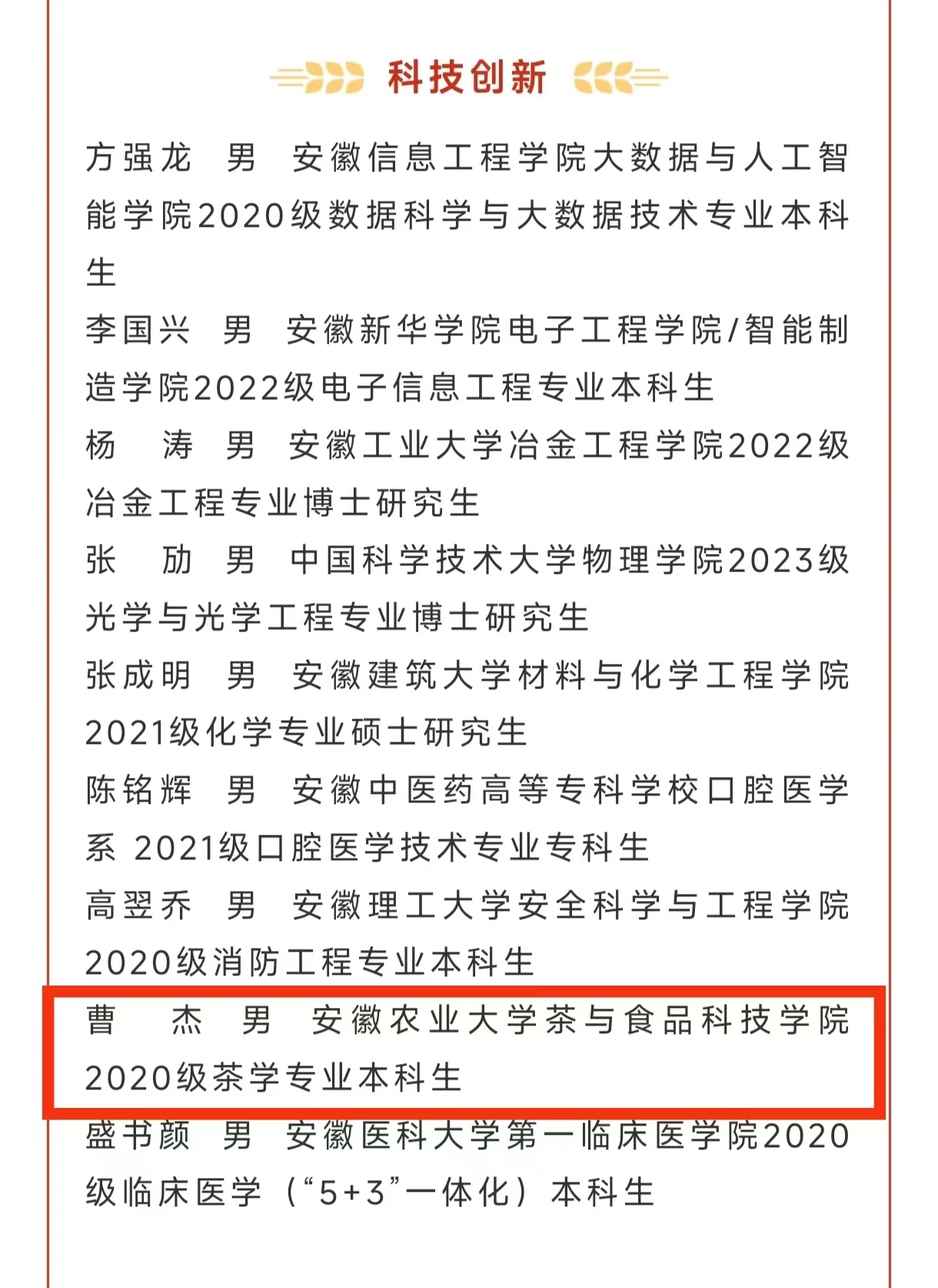 本网讯 近日,2023年安徽省“十佳百优”大学生奖学金获得者名单公布,我院学生曹杰获得科技创新类奖“百优”大学生。
