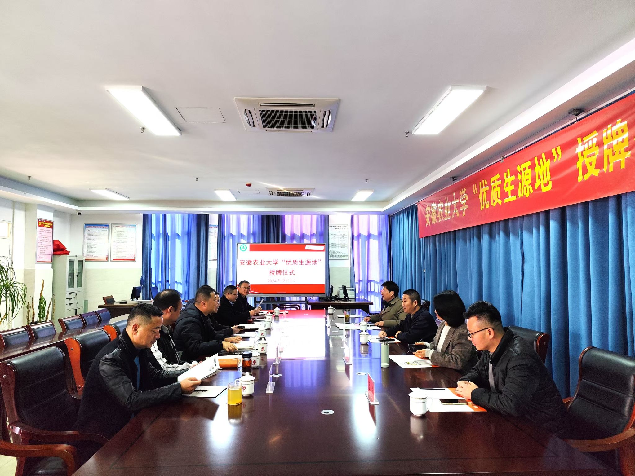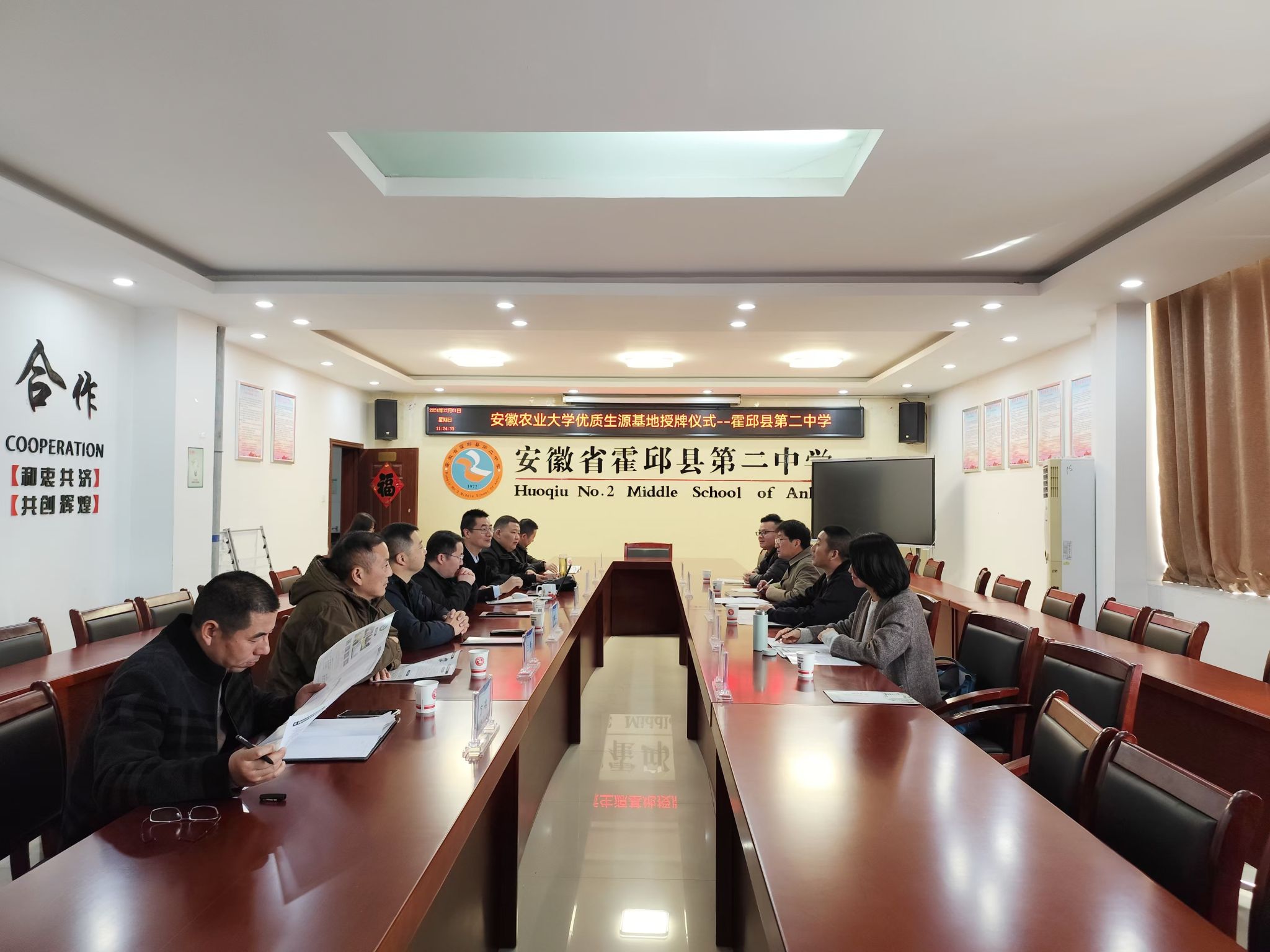 本网讯 为做好本科生招生宣传工作,让广大考生、社会各界对我校有更加全面的了解,提高本科生生源质量,进一步拓展优质生源基地。12月1日,校教务处副处长兼招生办副主任钱慧、茶业学院党委书记姜家生、党委副书记沈周高等一行五人赴霍邱县第一中学、第二中学,开展座谈会、送考研喜报、授予优质生源基地牌匾、专题讲座等活动。霍邱县政府办营商中心主任吴超、县委教育工委委员刘春生、霍邱县第一中学、第二中学的校主要领导、高三年级主任及班主任代表参加了座谈会。