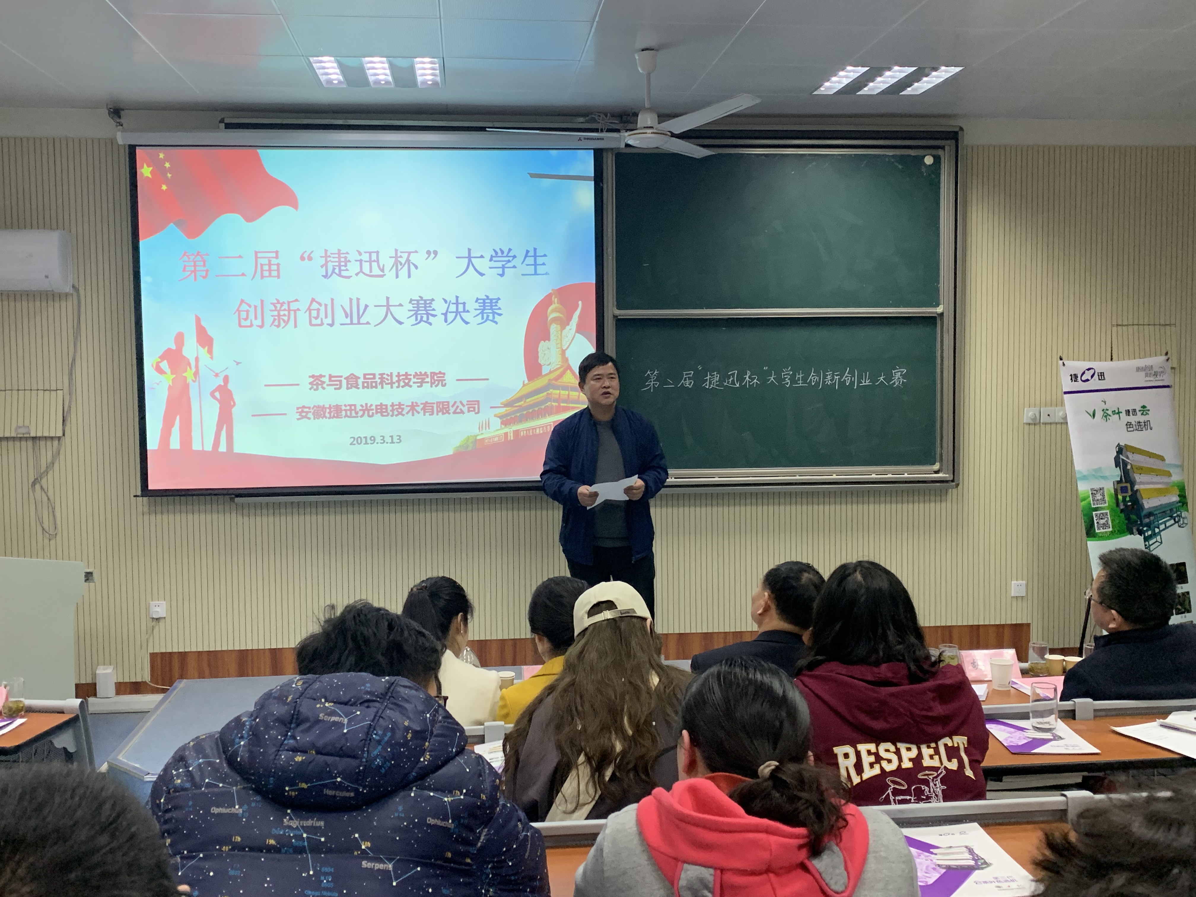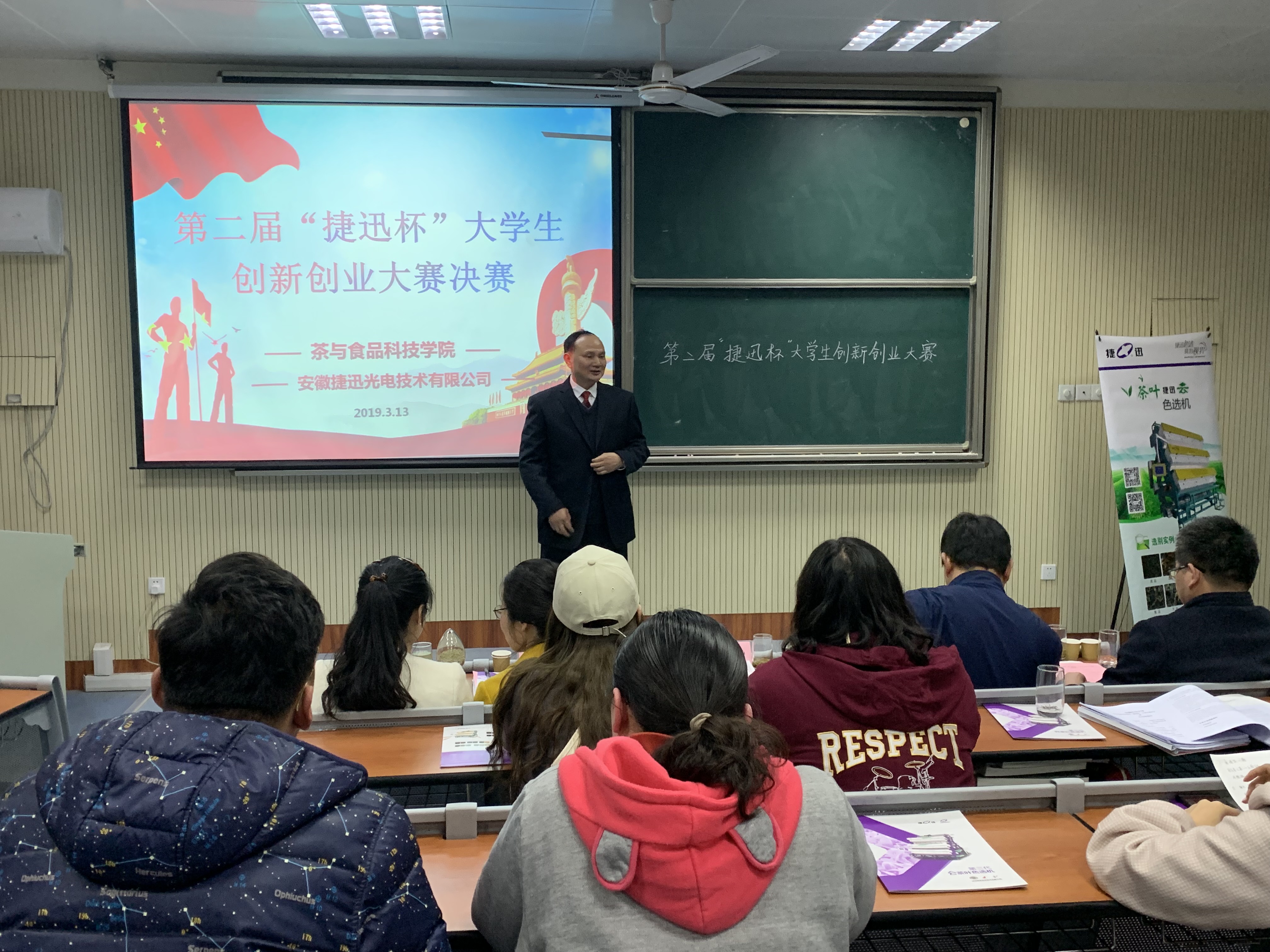 本网讯 3月13日,茶与食品科技学院第二届“捷迅杯”大学生创新创业大赛决赛暨颁奖仪式在茶业楼1992室精彩举行。安徽捷迅光电技术有限公司行政副总经理高光楷、学生公寓小区管理中心主任胡启涛、校团委副书记任琪,学院党委书记崔云、院长张正竹、副书记兼副院长张国学、副院长周裔彬、副院长李大祥等出席并担任大赛评委。