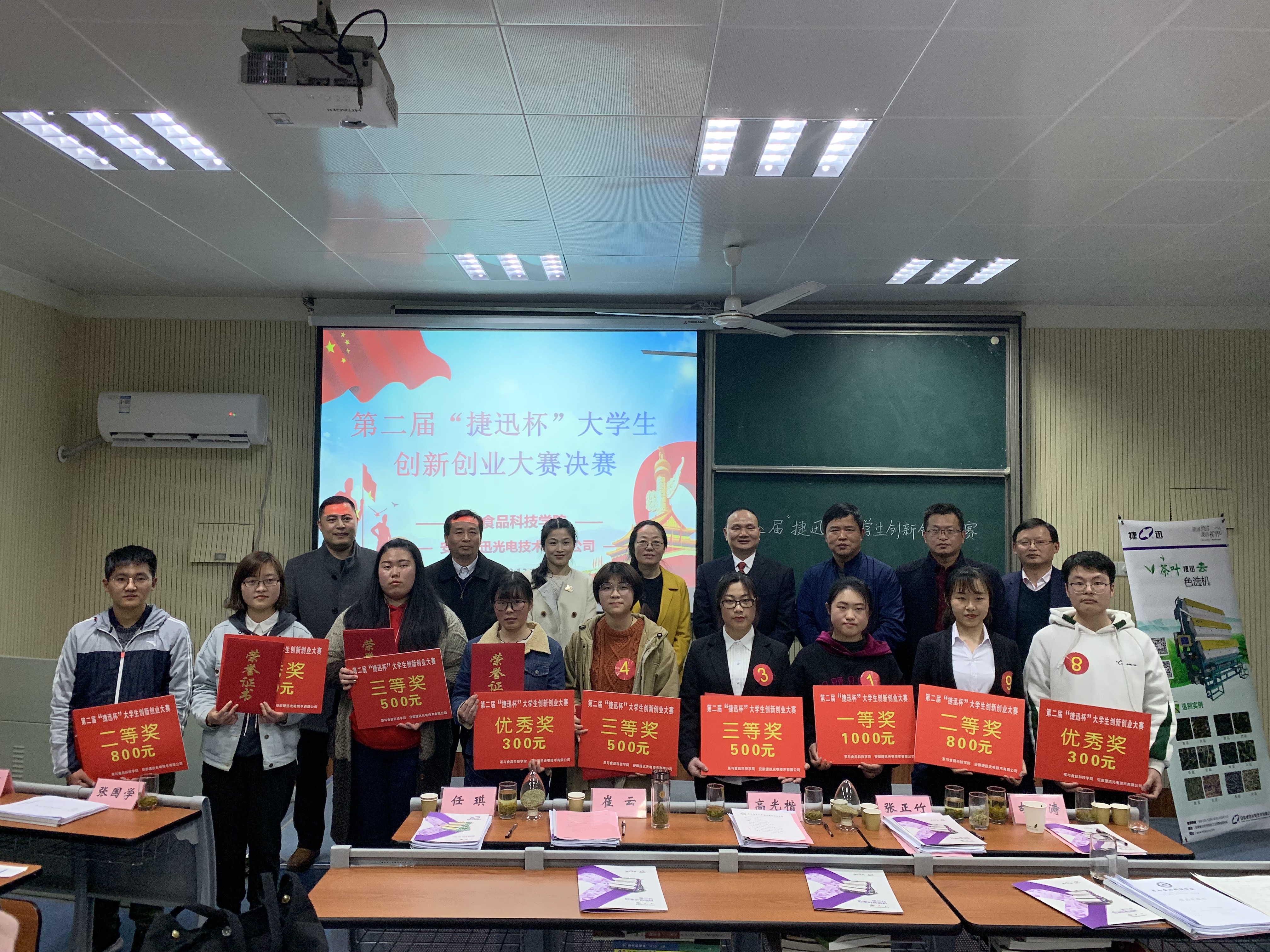 本次大赛由安徽农业大学茶与食品科技学院主办,安徽捷迅光电技术有限公司赞助支持。大赛自2018年10月份启动,经过同学们的精心准备,最终9个团队入围决赛。经选手答辩、专家评委合议,来自17食品质量与安全徐仪倩的“醇优智能蒸酒机”项目荣获冠军,获得1000元资金扶持;“一种基于食茶昆虫源生物酶发酵的新型茶产品研发”、“挤压重组绿茶及膨化茶米饼”项目荣获二等奖及800元扶持资金;“麦森”、“味同源餐厅”、“茶米子有限公司”项目荣获三等奖及500元资金扶持;“‘一鸡两吃’特色风味肉制品的研发”、“营养增强型纳米化茶多酚——胡萝卜素乳剂的研发”、“‘一嘉’猕猴桃——给最爱的人”项目荣获优秀奖及300元资金扶持。