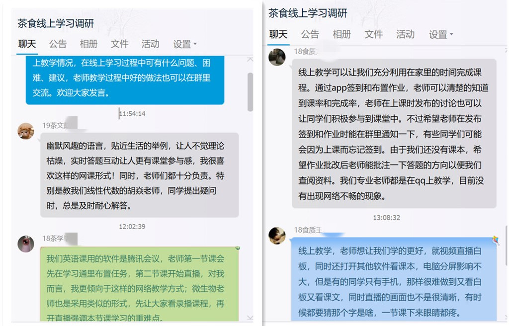注重质量,凝心聚力上“金”课。任课教师通过QQ语音、分享屏幕、腾讯课堂等多种方式线上直播、连麦互动,辅以学习通、we learn、批改网、i学等APP同步开展教学活动,同学们通过屏幕分享在课堂上讲解自己的课程PPT,多种形式参与互动讨论,使得课程的学习不打折扣。“线上教学让我们不再焦虑,我们能够像平常一样上课和学习,甚至比以前更主动更努力。”刚上完课的食质专业学生龙俊好说到。学习茶文化的戴凤临说:“我们的英语教师王晓卿上课幽默风趣,举例贴近生活,让人不觉理论枯燥,实时答题互动让人更有课堂参与感,我很喜欢这样的网课形式!”