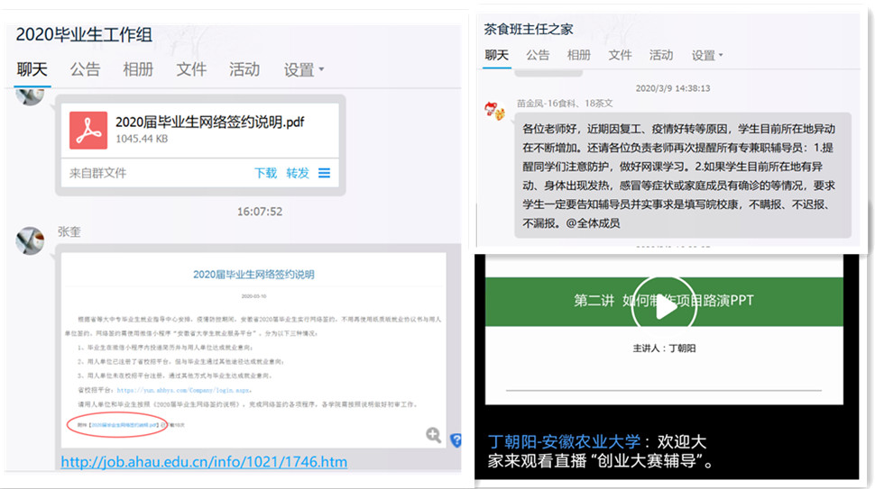 强化指导,优化设计上“优”课。疫情期间,为保障学生宅家不宅志,学院党委积极组织开展系列线上活动,学院团委牵头组织全体师生观看“全国大学生同上一堂疫情防控思政大课”和安徽农业大学“开学第一课”,不敷衍,不作秀,呼吁青年学子坚定信心、自觉行动、顽强斗争。学院学工队伍和党支部书记积极配合,做好网络辅导和心理疏导,引导学生正确认识网络教学的必要性与重要性,引导学生遵守在线教学秩序;认真摸排网络学习困难学生情况,制定帮扶方案,学习成绩优异的同学帮助他们录屏、分享笔记,确保在学习的道路上一个都不掉队,学习效果不打折。同时结合学生实际情况积极做好线上教学、毕业生论文指导、就业信息发布、考研复试等工作。考虑部分学生正处于创业大赛备赛阶段,特地邀请学校创业导师丁朝阳为茶食学子开展了创新创业赛前培训直播课。