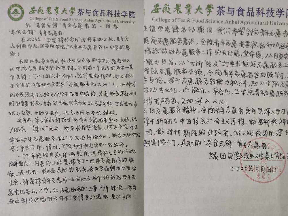 无论时代如何变迁,雷锋精神永不过时。社会的进步需要雷锋精神,我们仰望雷锋,更要走进雷锋;时代的发展需要雷锋精神,我们收获感动,更要付诸行动。学院团委始终引导学院“茶食先锋”青年志愿者走进雷锋、了解雷锋故事、弘扬雷锋精神,做校园里的“身边雷锋人”。学院团委将以“雷锋纪念日”为起点,把握时间节点,让学雷锋活动融入日常、化作经常,开展常态化的系列志愿服务活动,培养全面发展的社会主义建设者和接班人,将志愿服务活动做实做深,引领新时代大学生自觉把个人追求融入为党和人民事业奋斗中, 让雷锋精神在新时代绽放更加璀璨的光芒。(一审:刘鹏 二审:张宪林 三审:夏业鲍)